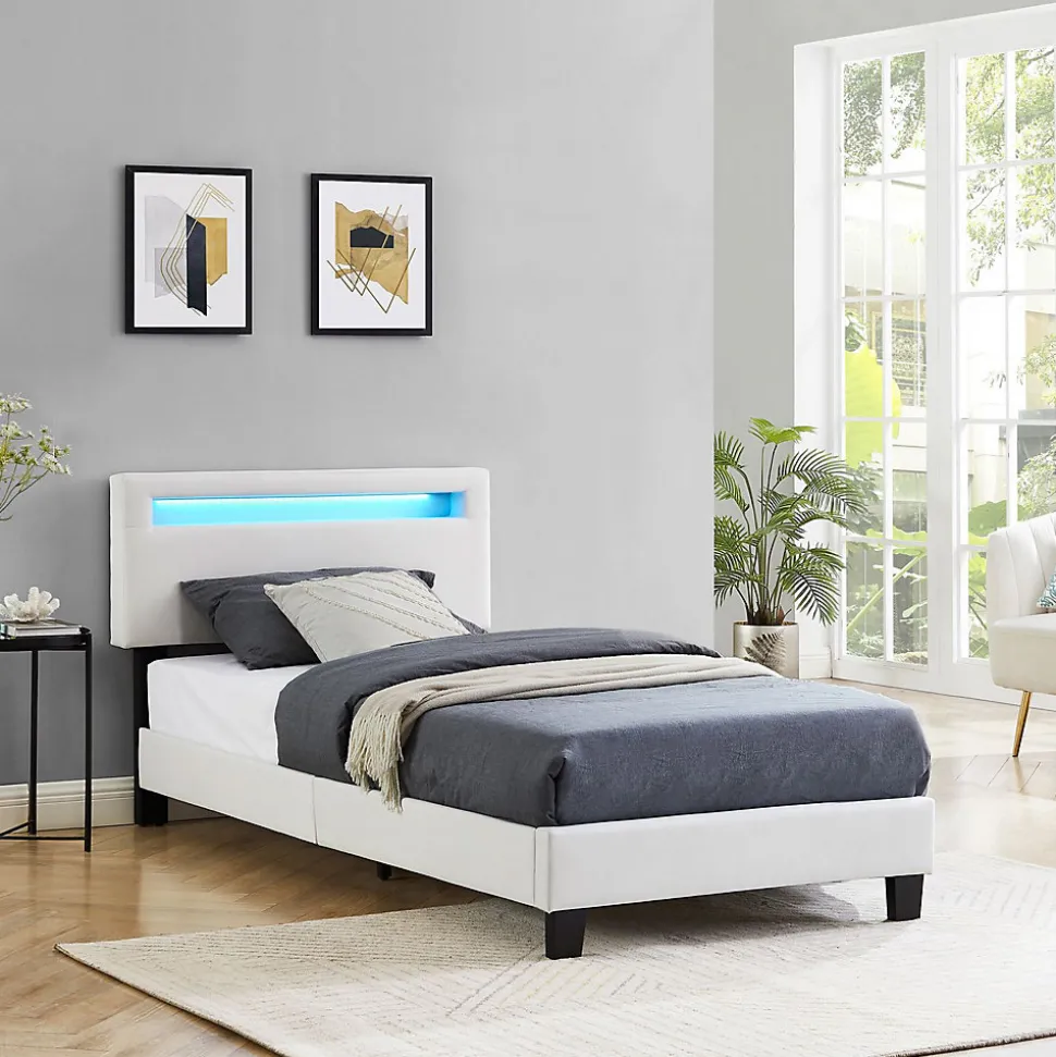Le lit led simple Austin … amènera une touche de modernité dans votre chambre grâce à son revêtement en tissu capitonné, à la fois élégant et intemporel. L’éclairage LED intégré dans la tête de lit sera parfait pour apporter une ambiance chaleureuse et passer une bonne nuit de sommeil. Le plus de ce lit, vous pouvez régler la hauteur de la tête de lit au montage selon 3 positions, ainsi vous pouvez ajuster ce lit selon votre taille ou la taille de votre matelas. Description des matériaux : – La structure du lit est recouverte d’un revêtement en tissu capitonné de coloris blanc. – Les pieds du lit sont en plastique de coloris noir. – Les lattes du sommier sont en contreplaqué. Caractéristiques du produit : – Lit simple 90 x 190 cm – Hauteur pieds de lit : 25 cm – Eclairage avec LED intégrées – Hauteur tête de lit (position basse) : 91 cm – Hauteur tête de lit (position moyenne) : 96 cm – Hauteur tête de lit (position haute) : 101 cm – Sommier à lattes inclus Livraison et montage : – Contenu de la livraison : lit, sommier, notice de montage – Le produit est livré en pièces détachées – Assemblage facile grâce à la notice – Livré sans matelas et sans décoration – Photo non contractuelle Résumé: – Hauteur tête de lit: 101 cm – Profondeur d’insertion: 4 cm – Convient uniquement avec: Sommier fagot à lattes – Description du matériel: 100% Polyester – Extras: Avec sommier à lattes – Traverse avec pied d’appui: Oui – Dimensions monté: 101 x 202 x 106 cm (H x L x L) – Couchage: 90 x 190 cm – Couleur: Blanc – Matériel: Tissu de recouvrement