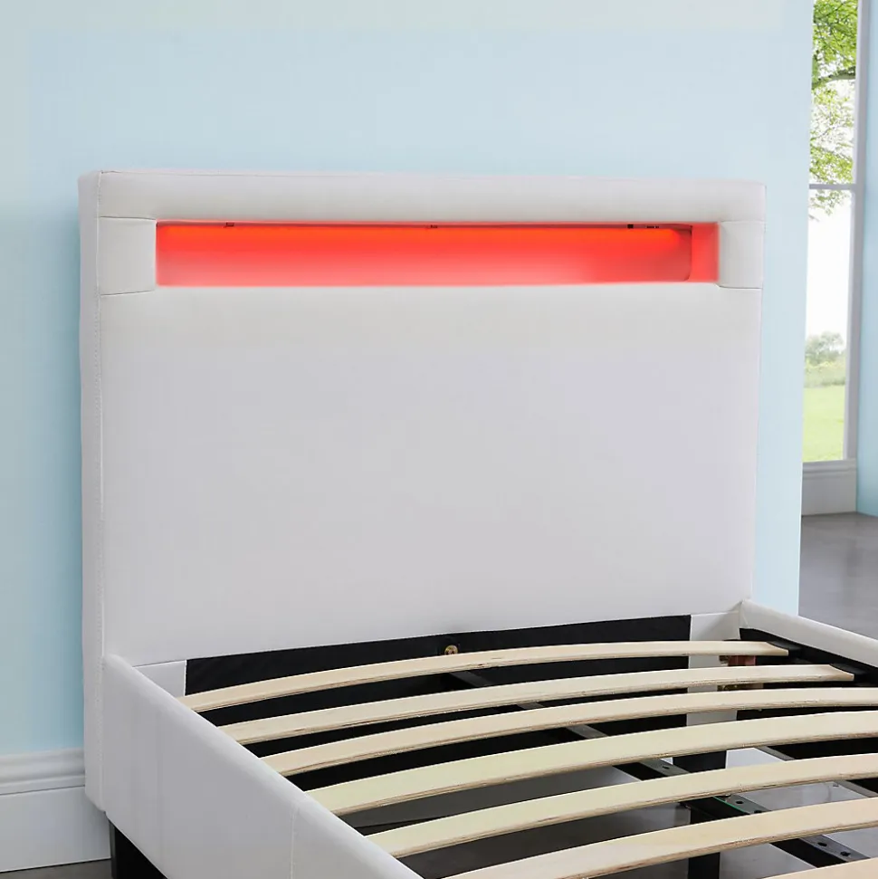 Le lit led simple Luceno … apportera à coup sûr une touche de modernité dans votre chambre ou dans celle de votre enfant. Sa tête de lit rembourrée contient un éclairage LED, dont vous pourrez modifier à volonté la couleur et les effets de lumière selon vos envies. Le design élégant de ce lit est également marqué par son revêtement en synthétique. La stabilité du lit est assurée par 4 pieds robustes et renforcée par la présence d’une traverse centrale et de 2 pieds de soutien supplémentaire sous le sommier à lattes, ce dernier est inclus dans la livraison. Description des matériaux : – Le cadre du lit est revêtu d’une matière synthétique de coloris blanc. – Les pieds du lit sont en plastique de coloris noir. Caractéristiques du produit : – Hauteur des pieds : 10 cm – Hauteur du sommier : 26 cm – Epaisseur tête de lit : 9 cm – Eclairage avec LED intégrées et non interchangeables – Avec télécommande et alimentation (longueur de câble : 210 cm) Livraison et montage : – Contenu de la livraison : lit, sommier, notice de montage – Le produit est livré en pièces détachées – Assemblage facile grâce à la notice – Livré sans matelas et sans décoration – Photo non contractuelle Résumé: – Hauteur pan de lit: 30 cm – Hauteur pied de lit: 30 cm – Hauteur tête de lit: 85 cm – Profondeur d’insertion: 5 cm – Convient uniquement avec: Sommier fagot à lattes – Description du matériel: 100% Polyuréthane – Extras: Avec sommier à lattes – Traverse avec pied d’appui: Oui – Dimensions monté: 85 x 96 x 206 cm (H x L x L) – Couchage: 90 x 190 cm – Couleur: Blanc – Matériel: Matière synthétique