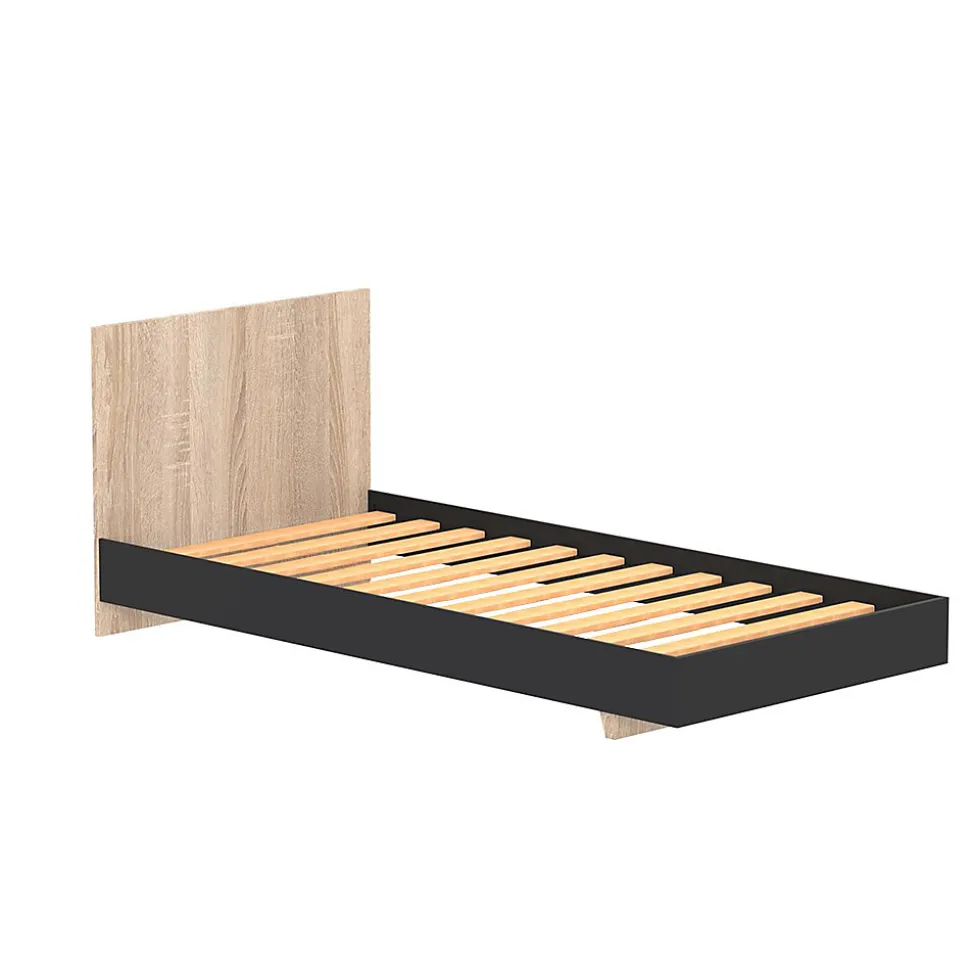 Lit LOFT 90×190 cmQue vous soyez à la recherche d’un style moderne, bohème ou encore scandinave, le lit LOFT saura s’intégrer à votre décoration. Avec son design pur et intemporel, il est parfaitement adapté pour une chambre d’enfant.Caractéristiques : Structure en panneau de particules.12 lattes multiplis.Finition : noir et décor chêne blanchi.Livré démonté avec un sommier et sans matelas. A monter soi-mêmeDimensions:192x94x75 cm