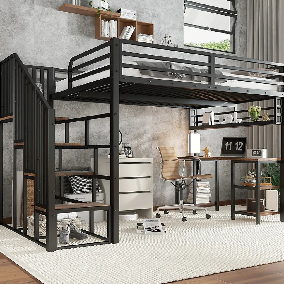 •【Avec bureau intégré】Ce lit mezzanine en fer forgé est doté d’un bureau intégré pratique, idéal pour les devoirs ou les activités créatives sans occuper d’espace supplémentaire.•【Escalier avec rampes pour un accès sécurisé】Ce lit mezzanine est équipé d’un escalier avec rampes qui s’adapte à la taille de l’enfant, permettant ainsi aux plus jeunes d’y accéder et d’en sortir facilement et en toute sécurité.•【Avec étagères de rangement】Outre le bureau, ce meuble dispose également d’étagères de rangement, idéales pour ranger livres, jouets ou fournitures scolaires, pour une chambre d’enfant bien rangée.•【Robuste】Le sommier à lattes robuste assure un soutien stable, une grande durabilité et un environnement de sommeil sûr.•【Taille classique】Ce lit mezzanine est disponible dans des dimensions classiques de 120 x 200 cm, offrant un grand espace de couchage et s’adaptant parfaitement aux dimensions typiques d’une chambre d’enfant.•【Facile à assembler】Des instructions détaillées et des pièces complètes sont disponibles pour vous aider à réaliser l’assemblage rapidement.