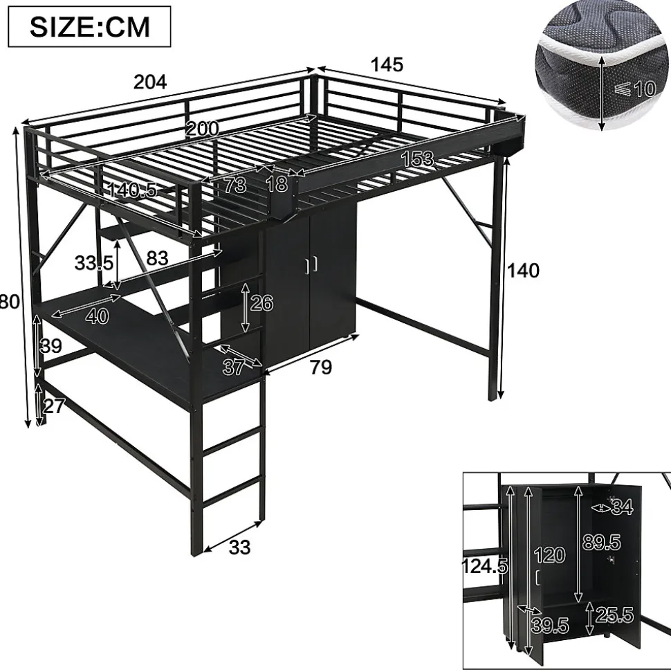 Spécifications● Dimension du produit : 204x145x180cm● Matériau du produit : Métal + MDF● Poids du produit : 83.5kg● Capacité de charge : 150kg● Épaisseur recommandée du matelas : Inférieur ou égal à 10 cm (Matelas non inclus)● Montage requis : Oui● Nombre de colis : 4Attentions● Ce produit est divisé en 4 colis pour la livraison. Il se peut qu’ils n’arrivent pas en même temps. Merci d’attendre patiemment.● La livraison comprend un cadre de lit, un sommier à lattes. Le matelas n’est pas compris dans la livraison.● Si vous avez des questions pendant l’installation, veuillez nous contacter dès que possible.