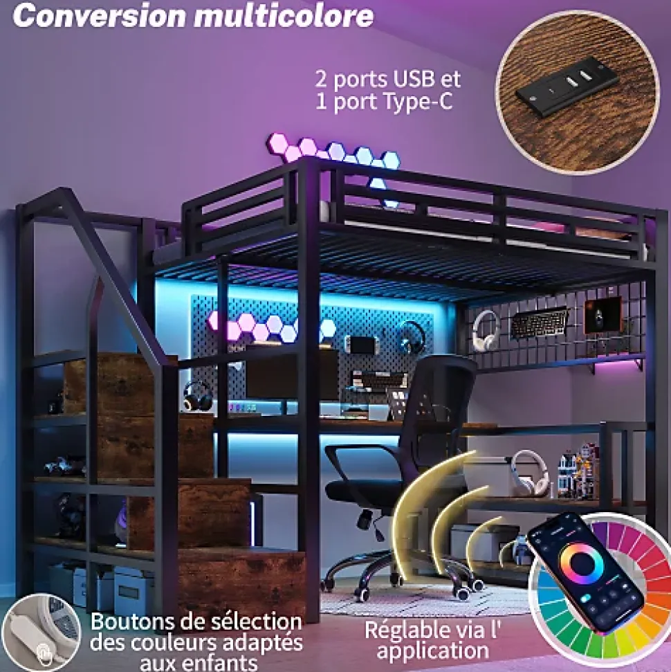 •【Un choix robuste】Une combinaison astucieuse d’une structure en métal et de panneaux de fibres de moyenne densité (MDF). La structure métallique durable assure un soutien stable au cadre de lit ; le MDF est inodore, préservant ainsi la santé de votre enfant.•【Un rangement organisé】Des étagères et des barres de suspension judicieusement intégrées permettent de ranger facilement les livres, peluches, petits sacs à dos et autres objets fréquemment utilisés. La conception à plusieurs niveaux optimise l’espace vertical et améliore l’organisation de la chambre.•【Un éclairage intelligent et apaisant】Les bandes lumineuses LED intégrées permettent de régler la couleur et la luminosité via une application. Un éclairage doux crée une ambiance apaisante, idéale pour favoriser un endormissement paisible.•【Recharge pratique】Équipé de deux ports USB et d’un port USB-C, ce lit répond aux besoins de recharge des différents appareils électroniques de votre enfant. Rechargez facilement vos appareils avant le coucher, sans avoir à chercher une prise.•【Étudier et se reposer en harmonie】Un bureau intégré à la tête de lit permet de concilier harmonieusement travail et détente. Ce lit superposé crée un espace de travail dédié pour votre enfant, ce qui permet de gagner du temps et d’améliorer son efficacité.•【Facile à assembler】Des instructions détaillées et des pièces complètes sont disponibles pour vous aider à réaliser l’assemblage rapidement.
