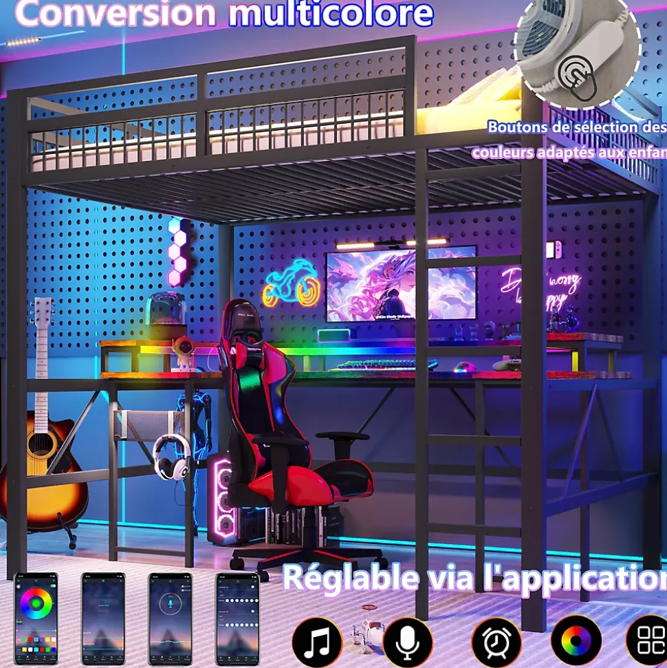▶ ▶ Détails ▶────────────────✦ Type de produit : Lit mezzanine✦ Couleur : Noir✦ Matériau : Métal + MDF✦ Dimensions du lit : 140 × 200 cm✦ Dimensions du produit : 204 × 144,5 × 180,5 cm✦ Poids net : 60 kg✦ Capacité maximale (lit) : 150 kg✦ Matelas inclus : Non✦ Épaisseur recommandée du matelas : 10 cm✦ Éclairage : Bande LED à changement de couleur✦ Ports de charge : 1 port USB + 1 port Type-C + 2 prises✦ Équipement : Bureau intégré, panneau perforé✦ Nombre de colis : 3✦ Montage requis : Oui► Remarques ►※ Ce produit est livré en 3 colis. Ils peuvent arriver à des moments différents.※ En raison de mesures manuelles, un écart de 2–3 cm peut se produire.※ Les images du produit sont prises avec le produit réel, mais des variations de couleur peuvent se produire en fonction de l’éclairage.