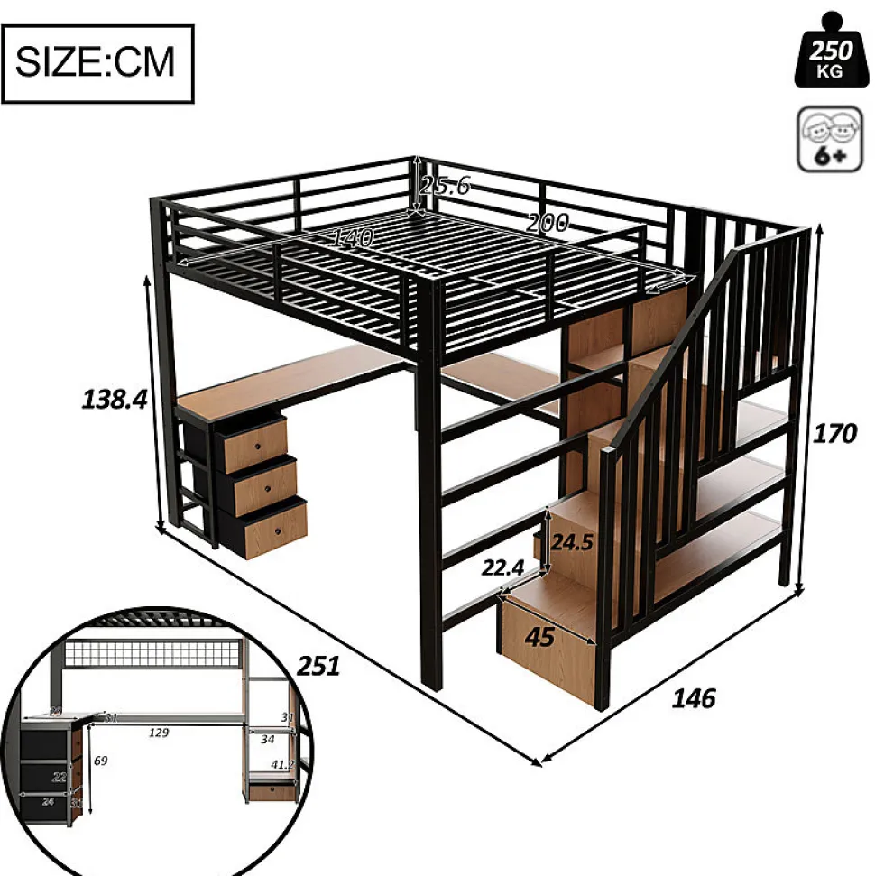 Spécifications● Couleurs du produit : Noir● Dimension du produit : 251x146x170cm● Matériau du produit : Métal + MDF● Poids du produit : 97kg● Capacité de charge : 250kg● Épaisseur recommandée du matelas : 10cm(Matelas non inclus)● Montage requis : Oui● Nombre de colis : 4Attentions● Ce produit est divisé en 4 colis pour la livraison. Il se peut qu’ils n’arrivent pas en même temps. Merci d’attendre patiemment.● La livraison comprend un cadre de lit, un sommier à lattes. Le matelas n’est pas compris dans la livraison.● Si vous avez des questions pendant l’installation, veuillez nous contacter dès que possible.● Remarque importante : en raison de la taille importante de cet article, il est possible qu’il soit expédié en plusieurs colis. Les colis peuvent arriver séparément. Veuillez vérifier si vous avez reçu un e-mail contenant plusieurs numéros de suivi après avoir reçu la notification d’expédition afin de pouvoir suivre la livraison de chaque colis.