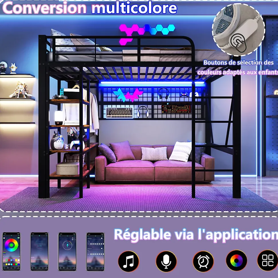 ▶ ▶ Détails ▶────────────────✦ Type de produit : Lit mezzanine✦ Couleur : Noir✦ Matériau : Métal + MDF✦ Dimensions du lit : 140 × 200 cm✦ Dimensions du produit : 204 × 145 × 180 cm✦ Poids net : 54 kg✦ Capacité maximale (lit) : 150 kg✦ Matelas inclus : Non✦ Épaisseur recommandée du matelas : 10 cm✦ Équipement : Ablagefach, filet de rangement, tringle à vêtements, espace ouvert sous le lit, bande LED intégrée✦ Nombre de colis : 2✦ Montage requis : Oui► Remarques ►※ Ce produit est livré en 2 colis. Ils peuvent arriver à des moments différents.※ En raison de mesures manuelles, un écart de 2–3 cm peut se produire.※ Les images du produit sont prises avec le produit réel, mais des variations de couleur peuvent se produire en fonction de l’éclairage.