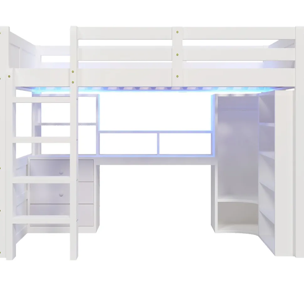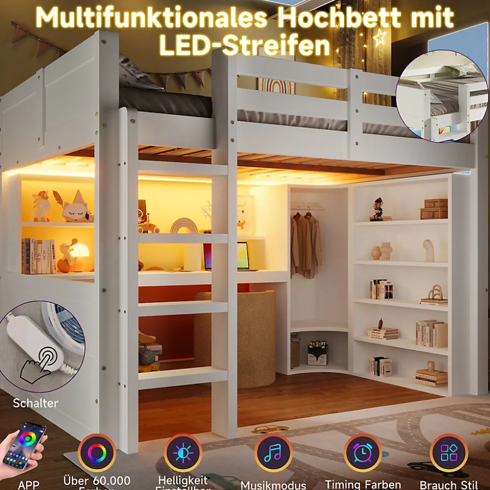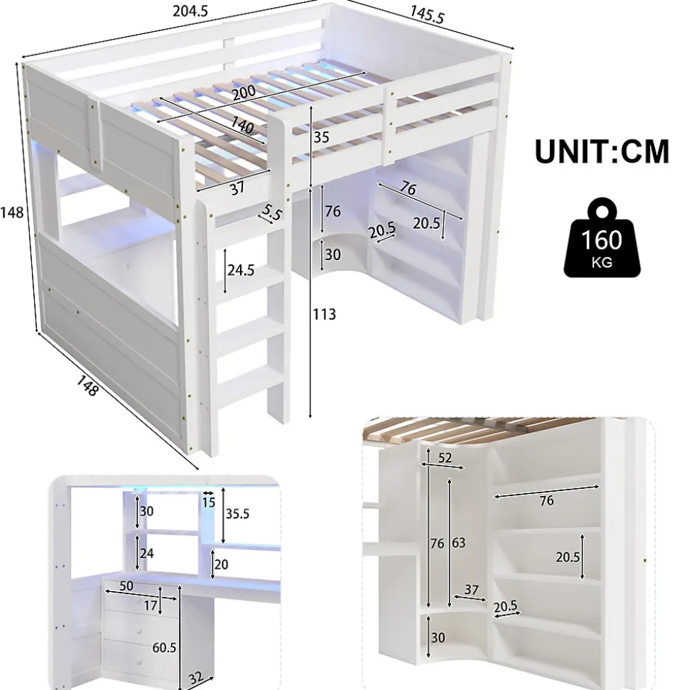 ▶ ▶ Détails ▶────────────────● Type de produit : Lit mezzanine● Couleur : Blanc● Matériaux : Pin massif + MDF + contreplaqué● Dimensions totales : 204,5 × 148 × 148 cm● Dimensions du couchage : 140 × 200 cm● Poids du produit : 118 kg● Capacité de charge : 160 kg● Éclairage LED : Oui● Matelas inclus : Non● Épaisseur de matelas recommandée (lit supérieur) : 10 cm● Montage requis : Oui● Nombre de colis : 5● Origine : Chine► Remarques ►※ En raison des mesures manuelles, une tolérance de 2 à 3 cm peut être constatée.※ De légères variations de couleur peuvent apparaître selon l’éclairage ou l’affichage de l’écran.※ Le produit est livré en 5 colis pouvant arriver séparément.※ En cas de question lors du montage, veuillez nous contacter rapidement.※ Veuillez noter que la longueur des lattes ne correspond pas exactement aux dimensions intérieures du lit.