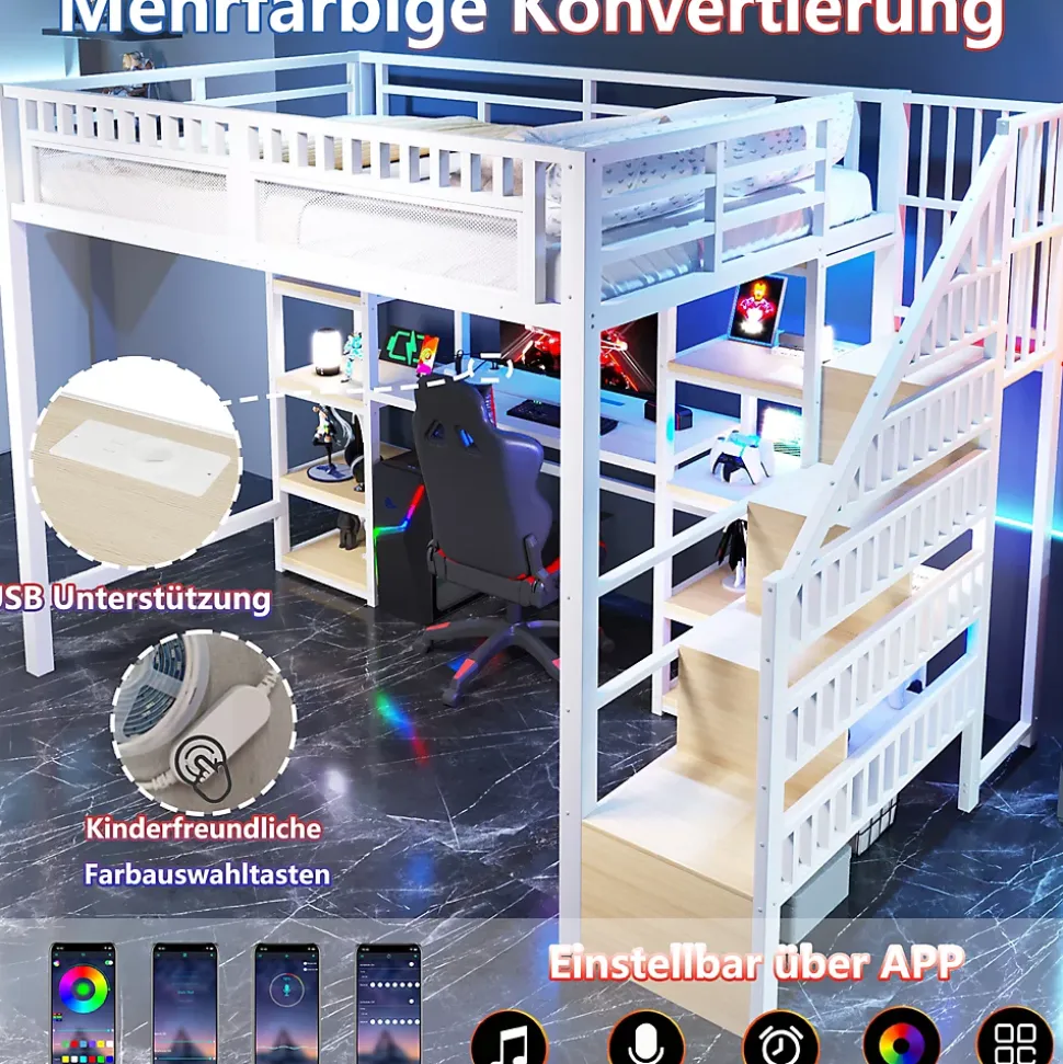 ▶ ▶ Détails ▶────────────────● Type de produit : Lit mezzanine● Couleur : Blanc● Matériaux : Métal + MDF● Dimensions totales : 255 × 146 × 174 cm● Dimensions du couchage : 140 × 200 cm (Ohne Matratze)● Poids du produit : 95 kg● Capacité de charge : 250 kg● Nombre de colis : 4● Origine : Chine► Remarques ►※ En raison de mesures manuelles, une variation de 2 à 3 cm peut survenir.※ Des différences de couleur peuvent apparaître en raison de l’eclairage ou de l’affichage de l’ecran.※ Le produit est livré en 4 colis qui peuvent arriver séparément.※ Veuillez vérifier l’ensemble des pièces avant le montage.