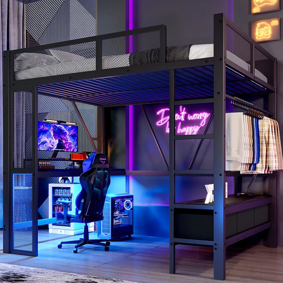 - 【Éclairage LED modulable】 Le bandeau LED placé sous le bureau ou le lit peut être réglé via télécommande avec différentes intensités et couleurs, créant un éclairage fonctionnel pour le travail ou une ambiance douce pour le sommeil.