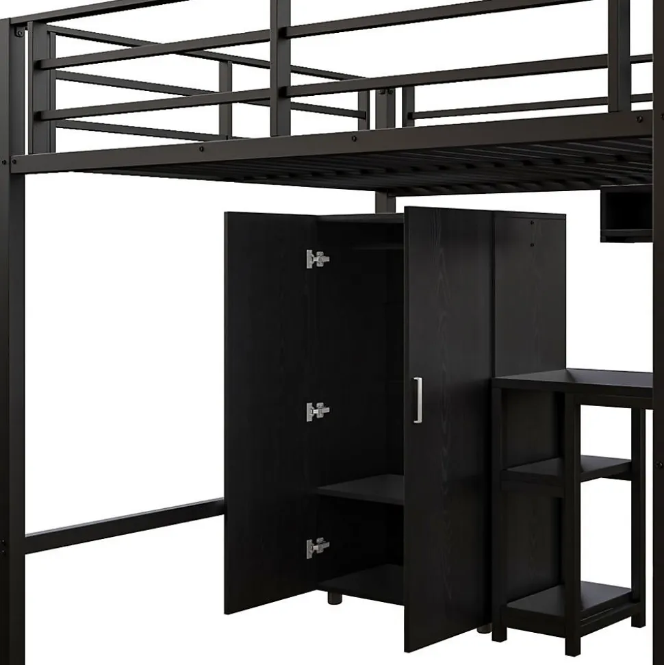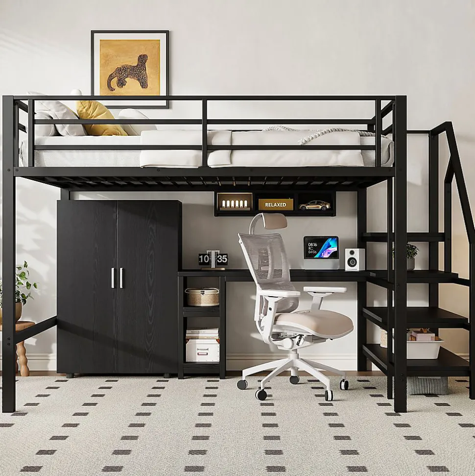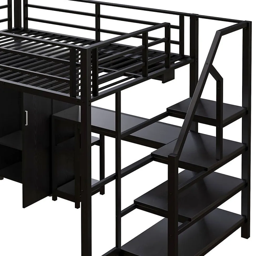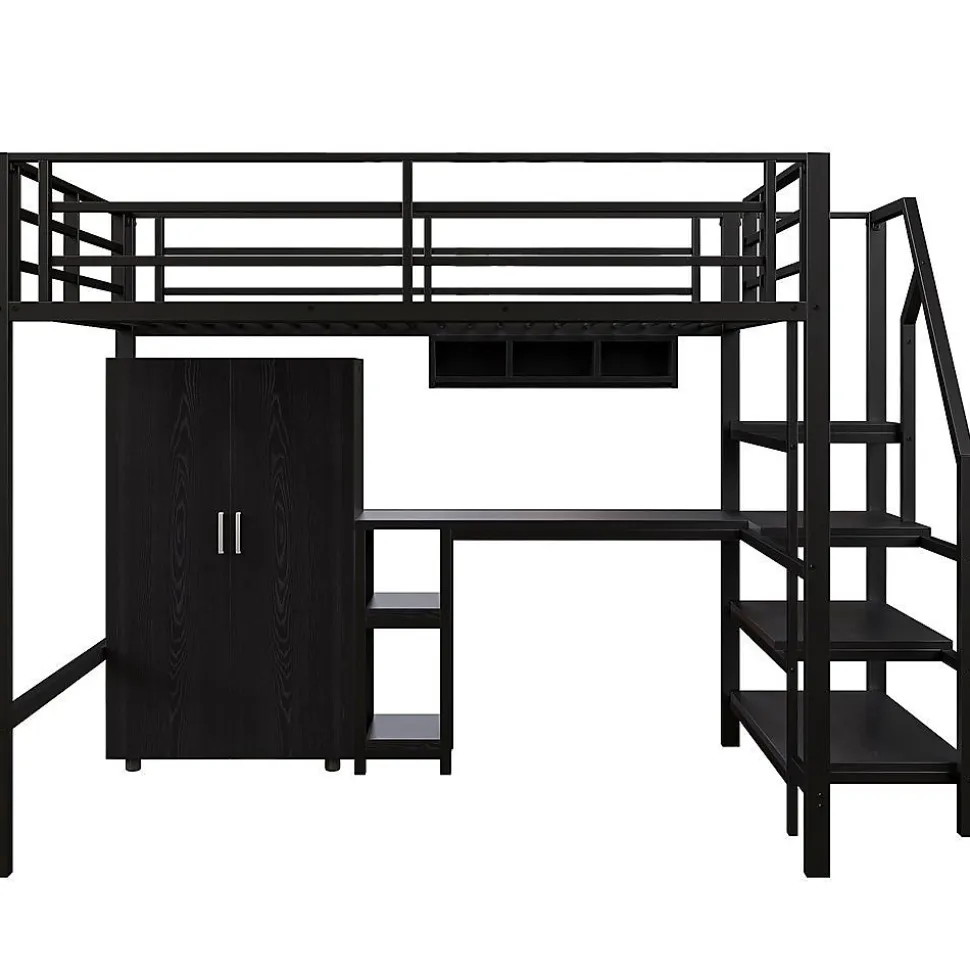 Lit mezzanine multifonction 140×200 cm – Noir (Métal + MDF)Espace optimisé pour chambre d’enfant :Structure complète : Lit haut + bureau intégré + armoire + étagèresRangement intelligent : Étagères multiples + espace sous l’échelle aménagéBureau pratique : Surface de travail intégrée pour études et jeuxStructure robuste : Cadre métal + panneaux MDF (support 150kg)Caractéristiques techniques :Dimensions totales : 255x145x160 cmEspace lit : 140×200 cm (matelas 10cm non inclus)Livraison : 4 colis (27.2kg + 28.56kg + 24.45kg + 29.27kg)Montage : Requis (notice incluse)Idéal pour : Optimisation d’espace, chambre d’enfant fonctionnelle