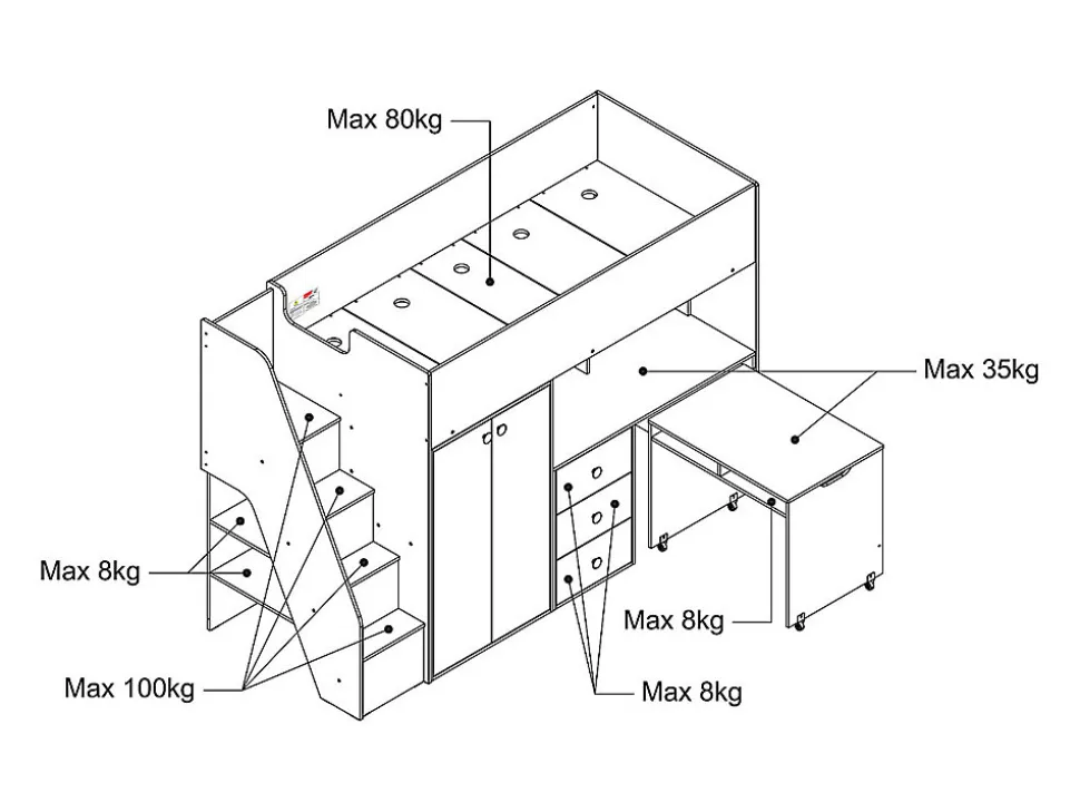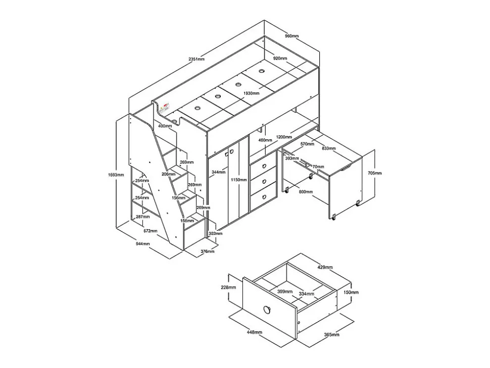 Avec son design contemporain et ses nombreux rangements le lit mezzanine LANILATO est la solution idéale pour gagner de l’espace. Combinant une armoire spacieuse et un bureau pratique, il offre tout l’espace nécessaire pour une chambre toujours bien ordonnée. Son style épuré s’adapte facilement à tous les types de décoration, apportant à la fois confort et modernité à votre espace!Caractéristiques Couleur (nuance) : Blanc, Naturel clair Matière (précision) : Panneau de particule Taille (couchage) : 90 x 190 cm Nombre de places : 1 place Réversible Option (meuble) : Avec escalier Sans matelas Avec sommier Type de sommier : Cadre à lattes, Sommier plein en panneau Avec bureau 2 portes Porte battante Type de rangement : 3 tiroirs, 5 niches, 1 penderie Tiroir coulissant Charge maximale supportée : 80 kg À monter soi-même : Attention, ce lit haut ne convient pas aux enfants de moins de 6 ans : Le lit est compatible avec tous les matelas 90 x 190 cmDimensions Longueur : 235.1 cm Hauteur : 160.3 cm Profondeur : 97.5 cm Hauteur sous la mezzanine : 115 cm Hauteur de la barrière de sécurité : 39 cmLivraisonLors de la livraison, il est conseillé de vérifier que le bon nombre de colis a été livré.ColisColis n°1 : Longueur 172 cm, Largeur 102 cm, Hauteur 6 cm, Poids 37 kg. Colis n°2 : Longueur 172 cm, Largeur 99 cm, Hauteur 7 cm, Poids 40 kg. Colis n°3 : Longueur 206 cm, Largeur 45 cm, Hauteur 12 cm, Poids 42 kg. Colis n°4 : Longueur 155 cm, Largeur 56 cm, Hauteur 14 cm, Poids 48 kg. Colis n°5 : Longueur 96 cm, Largeur 62 cm, Hauteur 12 cm, Poids 32 kg.