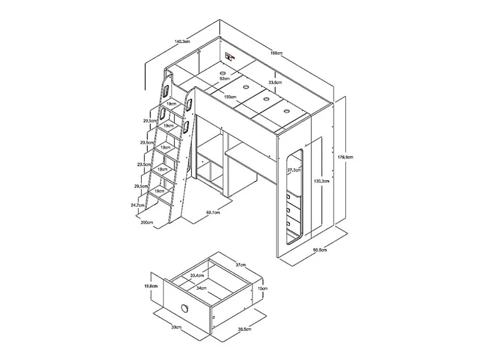 Caractéristiques Couleur (nuance) : Blanc, Naturel clair Matière (précision) : Panneau de particule Taille (couchage) : 90 x 190 cm Nombre de places : 1 place Option (meuble) : Avec escalier Sans matelas Avec sommier Type de sommier : Cadre à lattes Type de rangement : 3 tiroirs, 2 niches, Etagère, 1 penderie Charge max penderie : 10 kg Nombre d’étagères : 3 Tiroir coulissant Charge maximale supportée : 80 kg À monter soi-même : Ce lit est compatible avec tous les matelas 90×190 cm. : Attention, ce lit ne convient aux enfant de moins de 6 ans.Dimensions Longueur : 198 cm Hauteur : 180 cm Profondeur : 140.3 cm Hauteur de couchage : 139 cm Hauteur sous la mezzanine : 139 cm Hauteur de la barrière de sécurité : 33.5 cmLivraisonLors de la livraison, il est conseillé de vérifier que le bon nombre de colis a été livré.ColisColis n°1 : Longueur 144 cm, Largeur 45 cm, Hauteur 12 cm, Poids 35 kg. Colis n°2 : Longueur 195 cm, Largeur 63 cm, Hauteur 13 cm, Poids 61 kg. Colis n°3 : Longueur 153 cm, Largeur 66 cm, Hauteur 10 cm, Poids 40 kg. Colis n°4 : Longueur 208 cm, Largeur 45 cm, Hauteur 8 cm, Poids 35 kg.