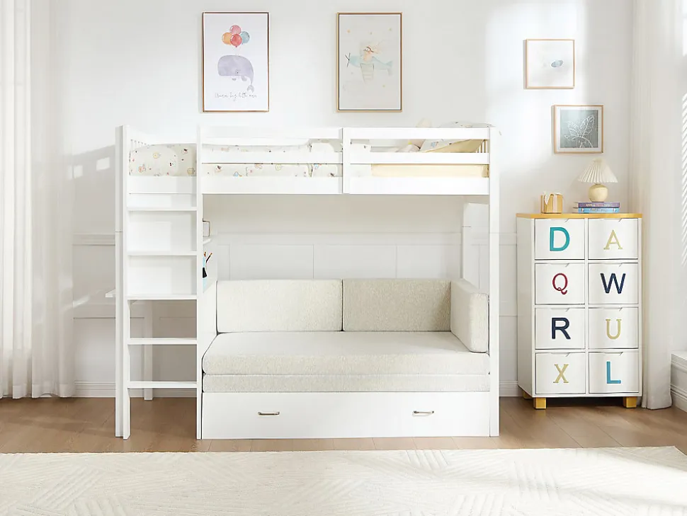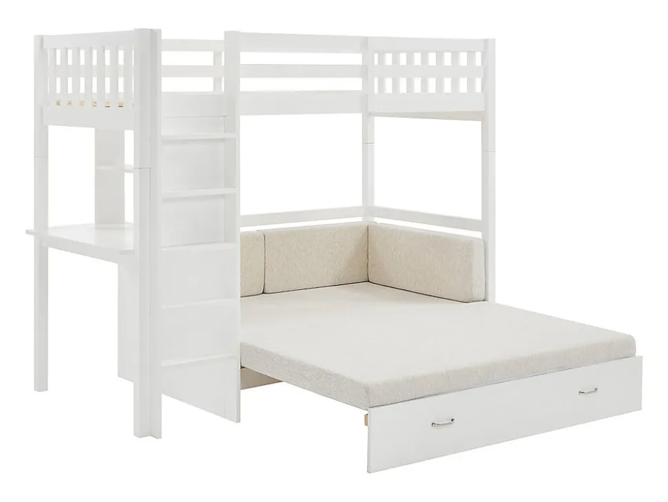 - Lit mezzanine 90 X 190 cm avec sofa convertible – Structure : Pin et MDF – Coloris : Blanc – Dim : L198 x P102,5 x H160 cm – Style : Contemporain – ORPELIA : le lit mezzanine qui allie style et praticité !
