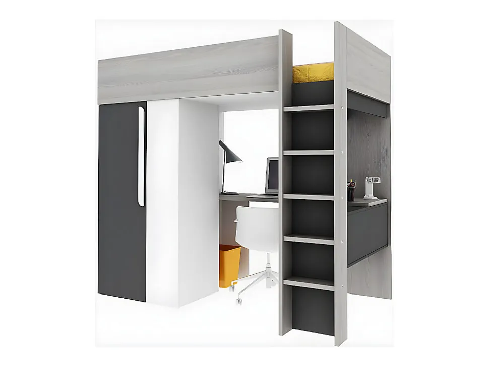 - Lit mezzanine NICOLAS II avec armoire et bureau – 1 niche – 90 x 200 cm. Structure : Panneaux de particules. Coloris : Gris Blanc et Noir. Dim : L205,2 x P110 x H183,1 cm. Meublez votre chambre en une seule fois avec le lit 3 en 1 NICOLAS II !