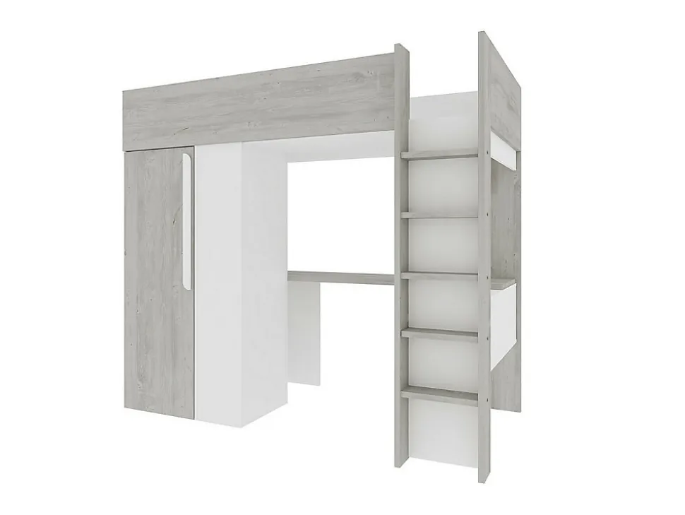 - Lit mezzanine 90 x 200 cm – Armoire et bureau – Structure : Panneaux de particules – Coloris : Naturel grisé et blanc – Dimensions : L201,6 x P110 x H183,1 cm – Style : Moderne + Matelas – Meublez votre chambre avec le lit 3 en 1 NICOLAS !