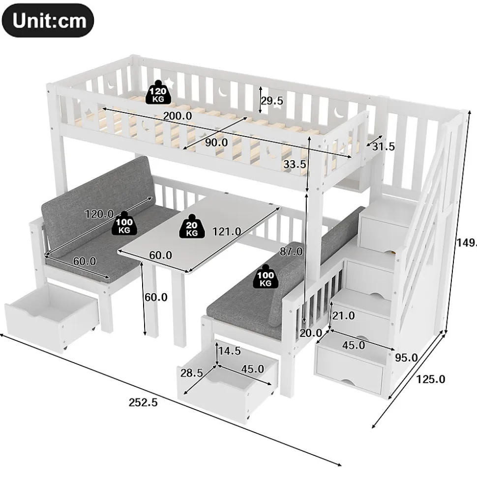 ▶ ▶ Détails ▶────────────────● Dimensions du produit : 252,5 x 125 x 149,5 cm (L x l x H)● Dimensions de couchage : 90 x 200 cm● Dimensions intérieures du lit : 90 x 200 cm● Hauteur totale : 149,5 cm● Couleur : Blanc● Matériau du lit : Pin + MDF + Plywood● Capacité de poids : 120 kg/150 kg● Épaisseur de matelas recommandée pour le lit supérieur (sans matelas) : 10 cm● Épaisseur de matelas recommandée pour le lit inférieur (sans matelas) : 10-15 cm● Montage requis : Oui● Nombre de colis : 5► Remarques ►※ En raison de la mesure manuelle, une différence de 2 à 3 cm peut survenir.※ Toutes les photos des produits ont été prises à partir de l’article réel. Cependant, de légères différences de couleur peuvent apparaître selon l’exposition à la lumière ou d’autres facteurs.※ Le produit est expédié en 5 colis, qui peuvent ne pas arriver en même temps. Merci de votre compréhension.