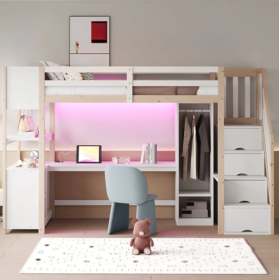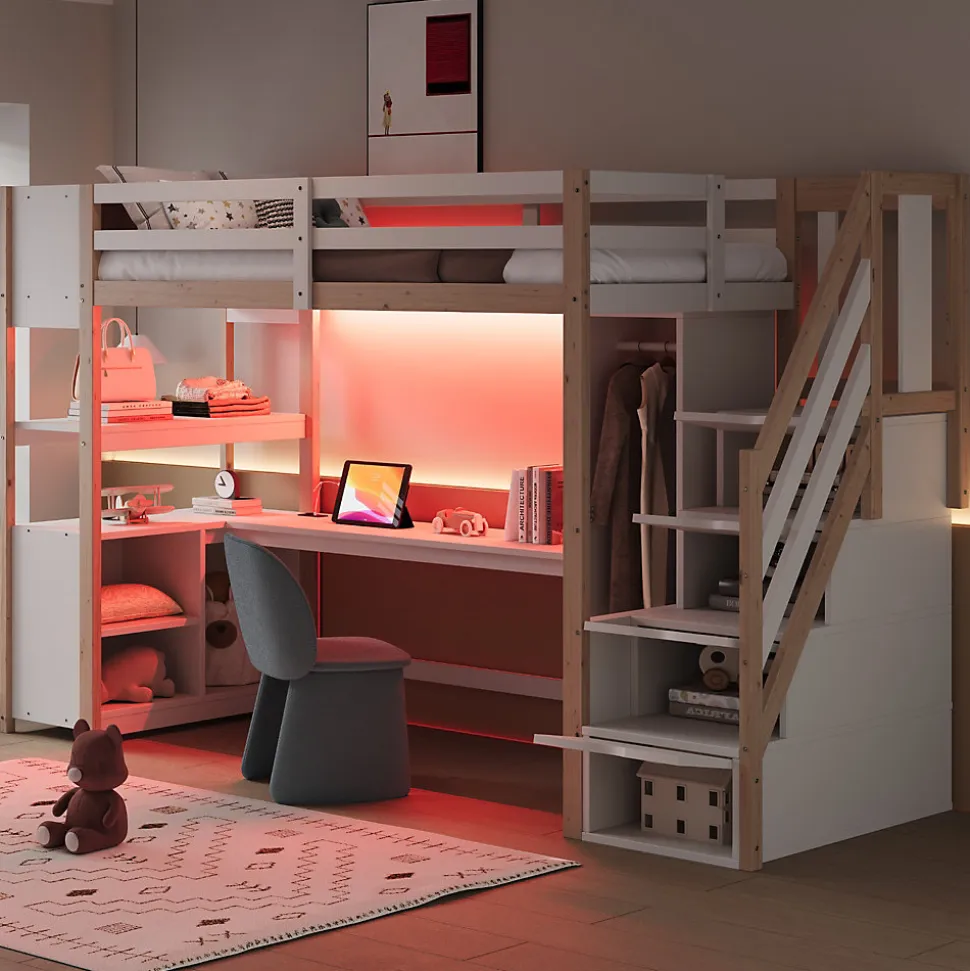 •【Bureau spacieux avec prise électrique standard européenne】Ce lit mezzanine est doté d’un bureau spacieux sous le couchage, équipé d’une prise électrique multifonctionnelle pour brancher divers appareils électroniques. Son design pratique est idéal pour travailler, étudier ou se détendre.•【Armoire intégrée】Ce lit mezzanine comprend une armoire intégrée pour un rangement pratique des vêtements, optimisant ainsi l’espace. Se changer devient facile et rapide.•【Éclairage LED multicolore】La structure du lit intègre des lumières LED. Les utilisateurs peuvent contrôler la bande lumineuse via leur smartphone et choisir parmi une variété de couleurs néon pour créer l’ambiance souhaitée.•【Escalier avec rangements intégré】Ce lit mezzanine dispose de quatre compartiments de rangement sous l’escalier, pratiques pour ranger livres, jouets, vêtements et autres objets, optimisant ainsi l’espace de la chambre et simplifiant l’organisation.•【Rangement intégré à la tête de lit】Ce lit simple en bois est doté d’un espace de rangement intégré dans la tête de lit, pratique pour ranger des objets tels que téléphones, réveils et livres pendant le sommeil.•【Étagères à plusieurs niveaux】Ce lit en bois est doté d’étagères à plusieurs niveaux, idéales pour sublimer la décoration intérieure. Vous pouvez y exposer des décorations, des plantes, des jouets et autres objets. Sa taille généreuse permet également d’y accueillir des objets plus volumineux, ce qui renforce son attrait décoratif.•【Facile à assembler】Des instructions détaillées et des pièces complètes sont disponibles pour vous aider à réaliser l’assemblage rapidement