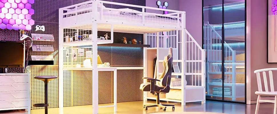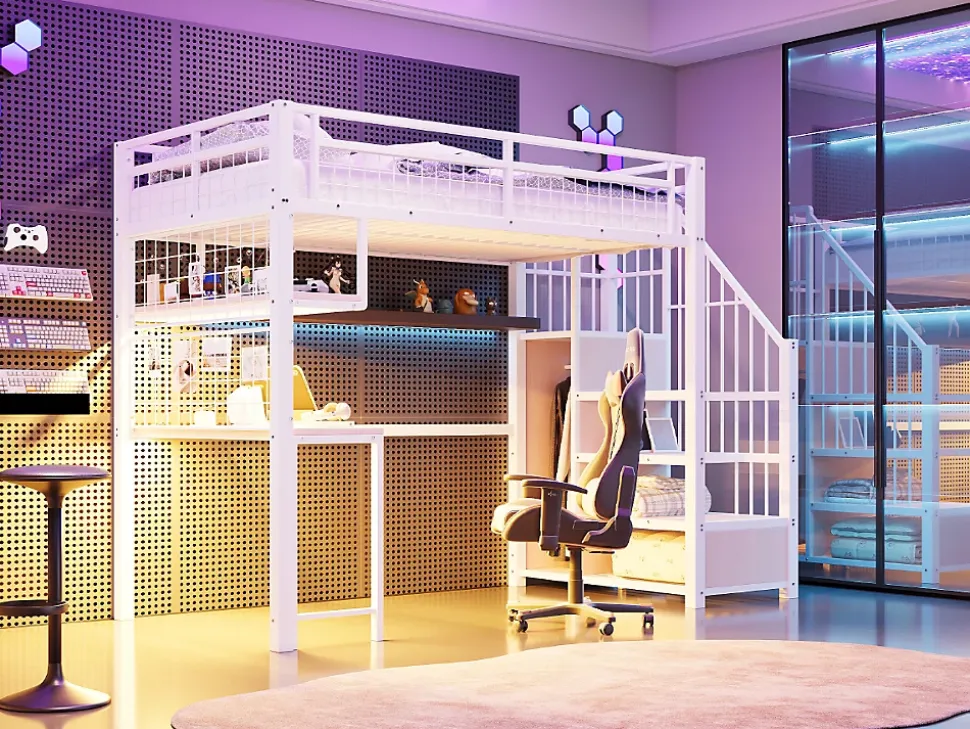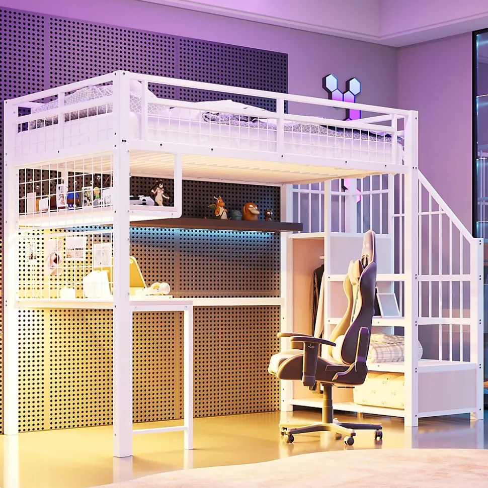 - Bureau intégré avec éclairage LED et prises, étagères et mur-grid multifonction sous le lit ; marche-échelle sécurisée offrant des compartiments et un petit placard pour vêtements et rangements.