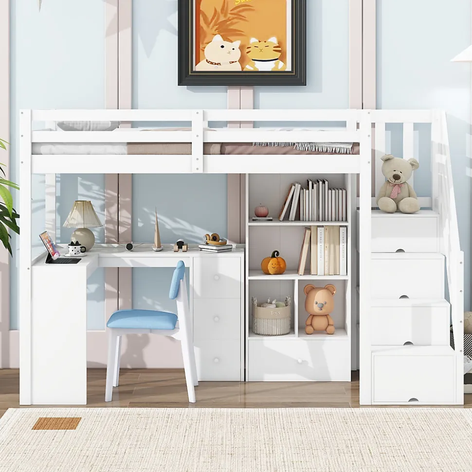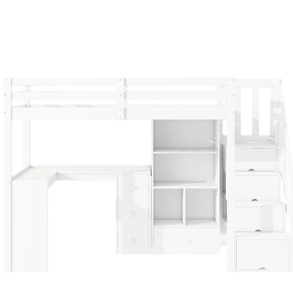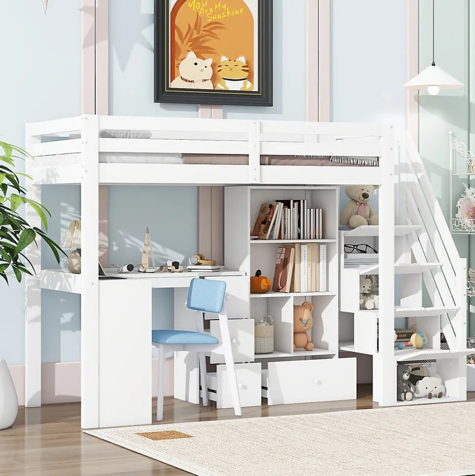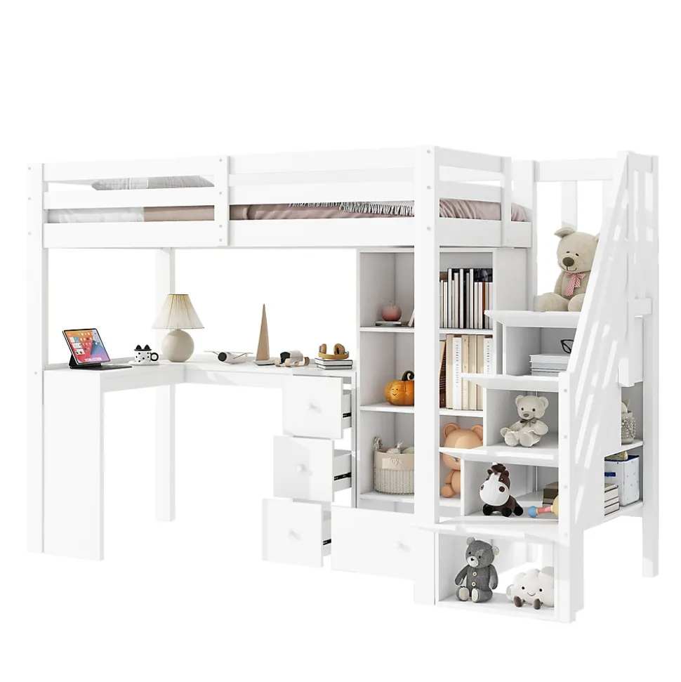 - Agencement optimisé avec bureau spacieux, tiroirs intégrés, placard ouvert et étagères multiples pour un rangement ordonné. Échelle de rangement pratique facilitant l’accès au couchage 90×200 cm.