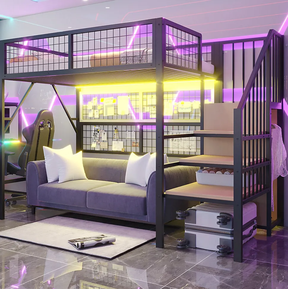 Design & optimisation de l’espaceCe lit mezzanine 90×200 cm associe une structure en métal noir à des éléments en MDF pour un rendu sobre et contemporain. Il libère un grand volume au sol, idéal pour aménager un coin bureau, un canapé ou un espace de jeu dans une chambre ou un studio.Fonctionnalités & rangements Grand espace libre sous le lit de 200x95x137 cm permettant l’installation d’un bureau, d’un canapé ou d’un rangement supplémentaire. Échelle latérale intégrant des étagères ouvertes et un petit dressing pour optimiser le rangement de livres, jouets ou vêtements. Bande LED pilotable via application smartphone pour ajuster couleur et intensité et créer différentes ambiances.Matériaux & sécuritéStructure principalement en métal avec panneaux MDF pour les parties vitrées, conçue pour un usage quotidien. Filet périphérique inclus pour sécuriser la zone de couchage ; capacité de charge indiquée 120 kg. Matelas non inclus.EntretienSurfaces faciles à entretenir : nettoyer avec un chiffon doux et un produit non agressif. Éviter les détergents abrasifs pour préserver les finitions.Montage & livraisonProduit livré en 3 colis (poids total environ 68 kg). Montage complet requis, estimation 2 heures, trois personnes recommandées. Tous les outils nécessaires sont fournis et aucun outil électro n’est nécessaire. Colis susceptibles d’arriver séparément.