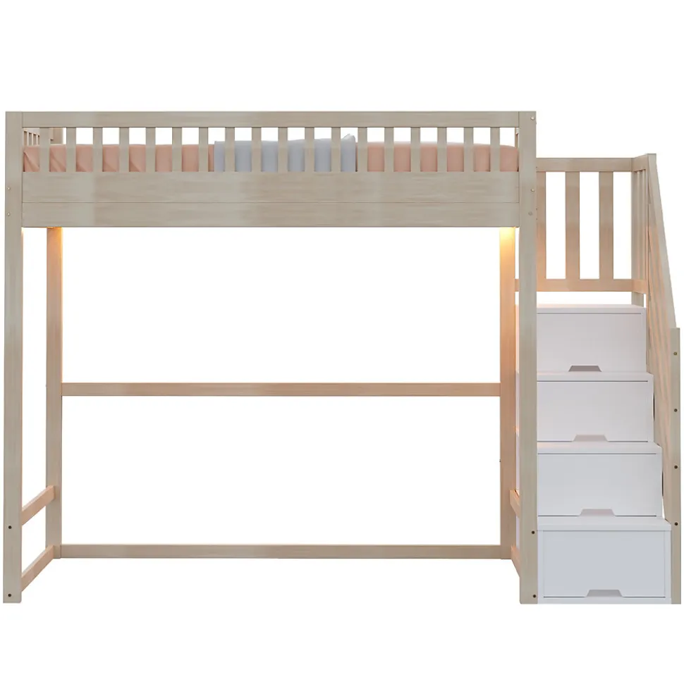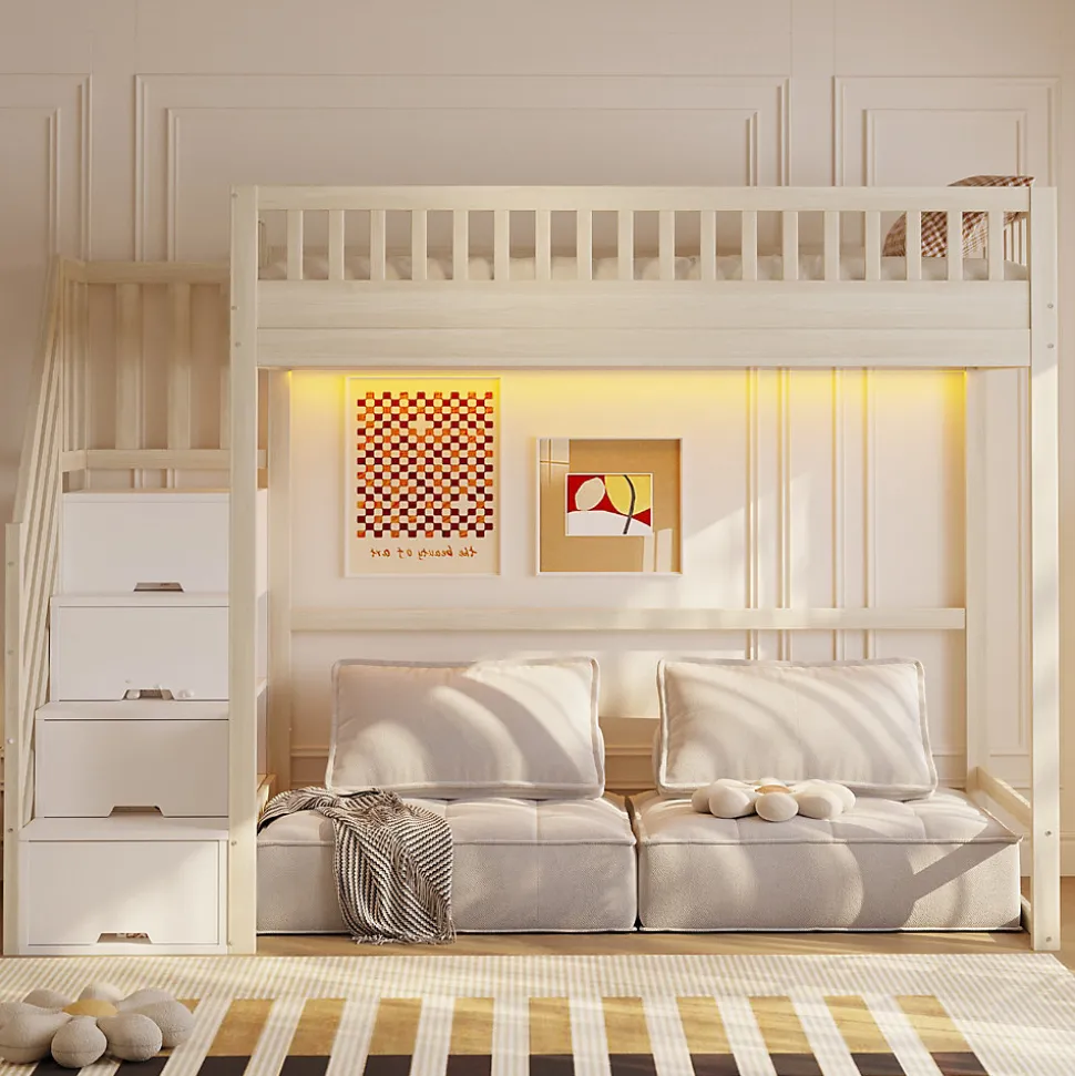 •【Sécurité renforcée 】Les barrières de lit plus hautes et les garde-corps continus entourant la zone de couchage offrent une protection fiable contre les chutes, garantissant un environnement de sommeil plus sûr pour les enfants et les adolescents. Une échelle robuste assure une stabilité optimale et un accès facile au lit.•【Échelle de rangement intégrée】Chaque barreau de l’échelle dissimule un espace de rangement pour les livres, les vêtements, le linge de lit ou les objets du quotidien, contribuant ainsi à garder la chambre propre et bien rangée.•【Espace ouvert sous le lit】L’espace ouvert sous le lit offre une grande flexibilité, permettant une configuration personnalisée de la chambre. Vous pouvez l’utiliser comme coin devoirs, coin lecture, espace de jeux ou aire de jeux pour enfants. À mesure que votre enfant ou adolescent grandit, cet espace peut être facilement réaménagé pour répondre à ses besoins.•【Éclairage LED intégré】Ce lit mezzanine est équipé de bandes lumineuses LED en partie basse, diffusant une lumière d’ambiance douce, améliorant la visibilité nocturne et créant une atmosphère chaleureuse et confortable.•【Construction en bois robuste】Ce lit mezzanine est fabriqué en bois durable et renforcé par un cadre solide, offrant une stabilité supérieure et une capacité de charge fiable.•【Escalier rétractable】L’escalier peut être installé à gauche ou à droite du lit, offrant une grande flexibilité d’installation pour s’adapter à différentes configurations de pièce et optimiser l’espace.•【 Montage facile】Des instructions détaillées et toutes les pièces nécessaires sont fournies pour un montage rapide.