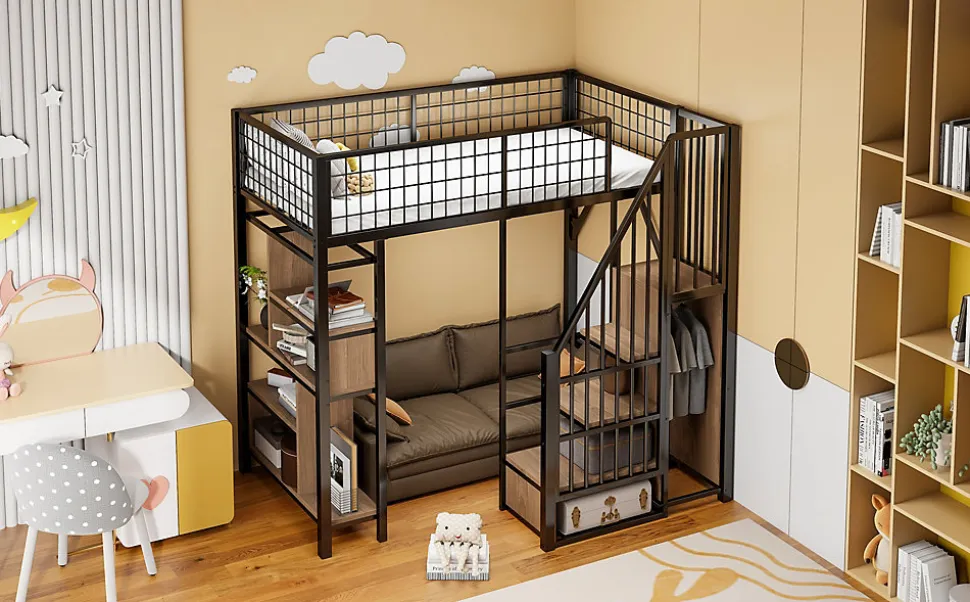 Design & styleCe lit mezzanine noir présente un style minimaliste et fonctionnel, conçu pour maximiser l’espace dans les logements compacts. L’association d’une structure métal et de panneaux en bois offre une silhouette contemporaine et sobre, adaptée à différents intérieurs sans surcharger la pièce.Fonctionnalités & rangement Escalier coffre stable avec marches servant de rangements pratiques pour chaussures, livres ou petits objets. Grand espace libre sous le lit pouvant être aménagé en bureau, coin lecture, coin TV ou zone de rangement selon les besoins. Plusieurs compartiments intégrés pour une organisation optimisée et un gain de place évident.Matériaux & entretienStructure en métal associée à des panneaux en contreplaqué et MDF pour une bonne stabilité et durabilité. Surfaces faciles à nettoyer avec un chiffon doux et un produit non abrasif. Conception adaptée à un usage quotidien tout en conservant une apparence soignée.Dimensions & caractéristiquesCouchage 90×200 cm. Dimensions totales : 204x143x170 cm. Poids total du produit : 76 kg. Poids colisé : 82 kg. Nombre de lattes : 20. Épaisseur de matelas recommandée : 8–10 cm. Capacité de charge indiquée : 114 kg.Montage & livraisonMontage complet requis, temps estimé 2 heures avec deux personnes recommandées. Produit livré en 3 colis pouvant arriver séparément. Outillage de base fourni ; évitez l’utilisation d’outils électriques pour préserver les éléments de fixation.