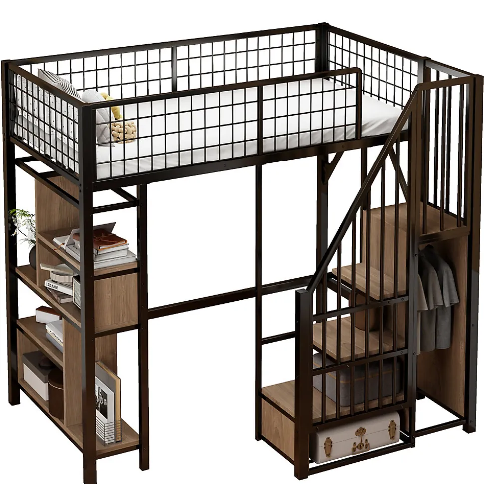 - Escalier coffre stable offrant des marches de rangement pour chaussures et livres, grand espace libre sous le lit modulable en bureau, coin détente ou zone de stockage ; couchage 90×200 cm compatible.