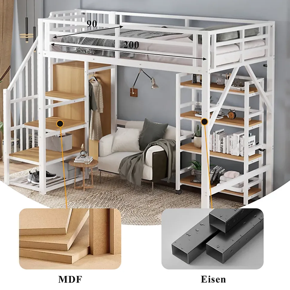 ▶ ▶ Détails ▶────────────────● Type de produit : Lit mezzanine● Couleur : Blanc + Nature● Matériau du cadre : Métal + MDF● Matériau des lattes : Métal● Dimensions totales : 255 × 95,5 × 170 cm (L x l x H)● Poids total : 71 kg● Matelas compatibles (non inclus) : 90 × 200 cm (épaisseur ≤ 10 cm)● Hauteur sous le lit : 137 cm● Capacité de charge : Lit: 120 kg, Étagère de rangement: 15 kg● Mode de montage : Auto-assemblage● Structure interchangeable de gauche à droite : Non● Nombre de colis : 3► Remarques ►※ En raison de la mesure manuelle, une tolérance de 2 à 3 cm peut s’appliquer.※ Toutes les photos ont été prises à partir du produit réel, mais une légère variation de couleur peut se produire à cause de l’exposition au soleil ou d’autres facteurs.※ Le produit est livré en 3 colis, qui peuvent ne pas arriver en même temps. Merci de patienter.