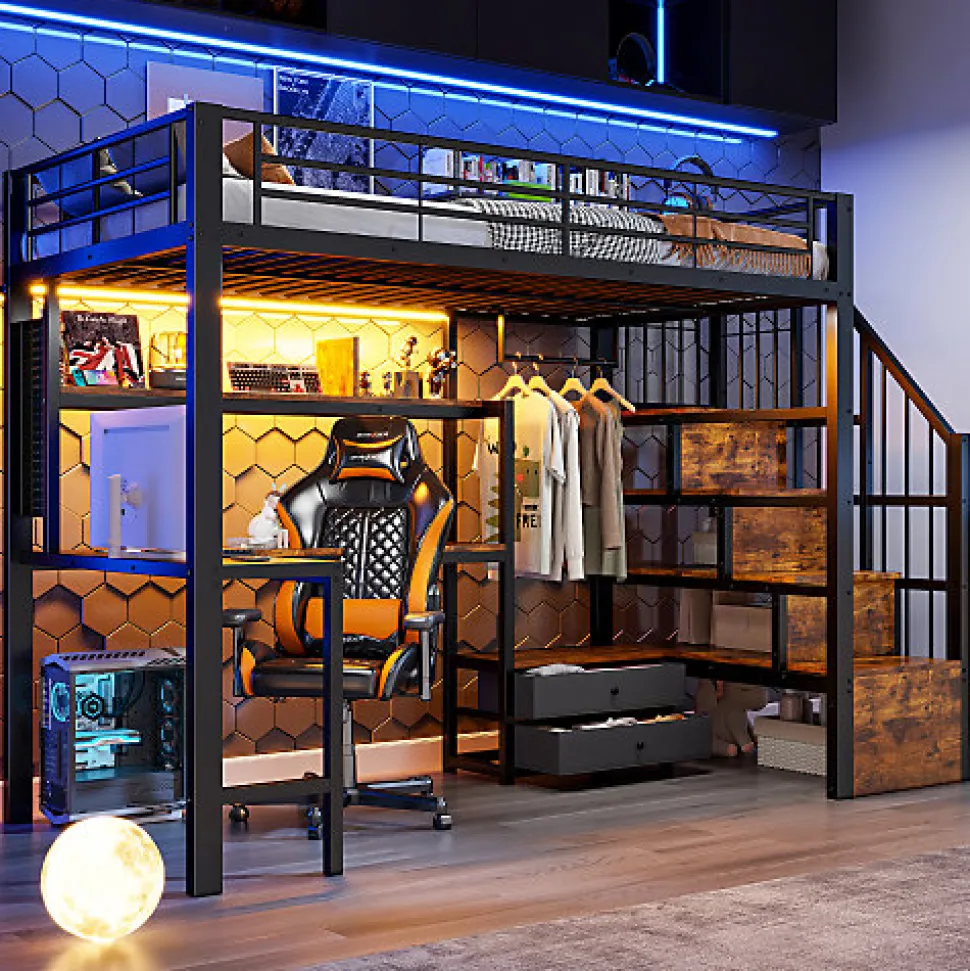 •【Espace de jeu et de repos multifonctionnel】Ce lit mezzanine intègre harmonieusement une chambre surélevée avec un bureau, une bibliothèque et un portant, idéal pour les adolescents et les petits appartements. Il optimise l’espace en combinant couchage, jeu, étude et rangement.•【Éclairage LED intégré pour une ambiance chaleureuse】Des bandes lumineuses LED sont installées sous le lit et dans l’espace bureau. Adaptables d’une simple pression sur un bouton ou via une application, elles permettent de régler facilement la luminosité et la couleur. L’éclairage crée une ambiance chaleureuse ou dynamique, soulignant le style moderne du lit.•【Rangement astucieux】Des coffres de rangement rectangulaires intégrés à l’escalier offrent un grand espace de rangement pour les vêtements, les jouets ou le linge de lit. De plus, des étagères en bois ouvertes, des tiroirs et des portants répondent à tous vos besoins pour une chambre bien rangée.•【Sécurité et stabilité garanties】Une structure métallique de haute qualité assure une grande robustesse et une excellente durabilité. Les barrières de sécurité hautes autour du lit supérieur préviennent les chutes et conviennent aux enfants à partir de 6 ans.•【Style industriel moderne】Une structure métallique associée à un design rustique en bois crée un style classique et intemporel qui s’intègre harmonieusement dans une variété d’espaces intérieurs — des salles de jeux et chambres d’adolescents aux appartements modernes — ajoutant une touche de modernité à n’importe quelle pièce.•【Facile à assembler】Des instructions détaillées et des pièces complètes sont disponibles pour vous aider à réaliser l’assemblage rapidement.