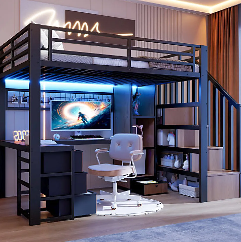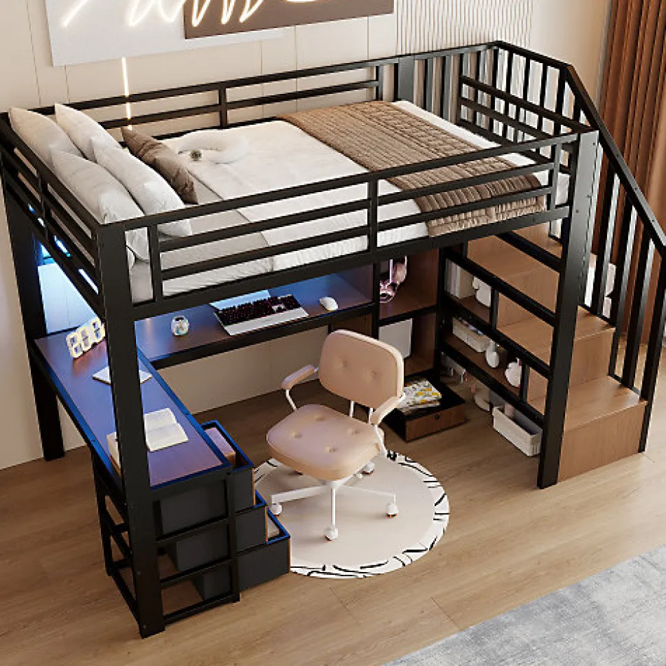 •【Construction robuste et durable】La combinaison d’une structure en acier et de panneaux de fibres de moyenne densité (MDF) garantit la robustesse, la durabilité et la sécurité de ce lit enfant, accompagnant ainsi la croissance de votre enfant.•【Éclairage intelligent et féérique】Les bandes lumineuses LED intégrées vous permettent de régler la couleur et la luminosité selon vos envies, créant une ambiance de sommeil apaisante et transportant votre enfant dans un monde féerique.•【Solutions de rangement optimales】Équipé d’étagères, de tiroirs et de penderies, ce lit offre un espace de rangement généreux pour les livres, les jouets et les vêtements, pour une chambre toujours propre et bien rangée.•【Espace de travail intégré】Le lit est doté d’un bureau intégré, fusionnant harmonieusement espace de travail et espace de repos pour créer un coin d’étude dédié et efficace pour votre enfant.•【Échelle de rangement astucieuse】L’échelle de rangement intégrée facilite l’accès au lit et offre un espace de rangement pratique et ludique.•【Facile à assembler】Des instructions détaillées et des pièces complètes sont disponibles pour vous aider à réaliser l’assemblage rapidement.