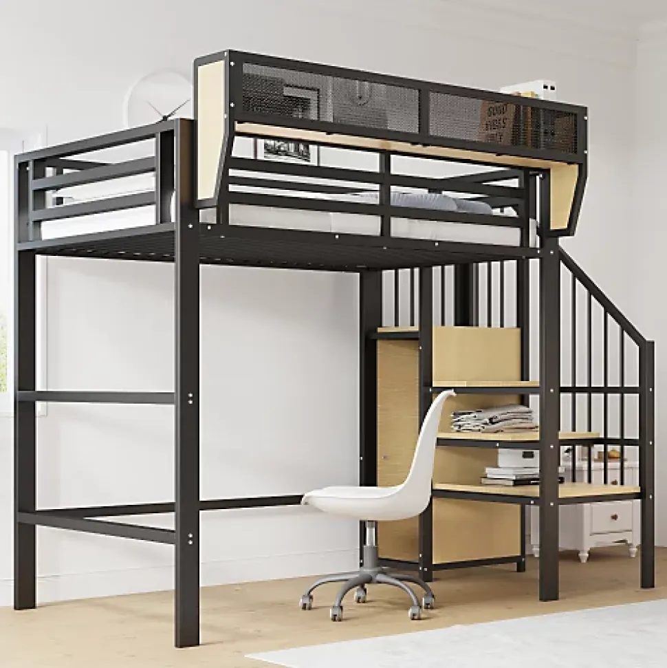 Lit mezzanine en métal noir 90×200 cm avec échelle sécurisée et étagère modulable, parfait pour petits espaces