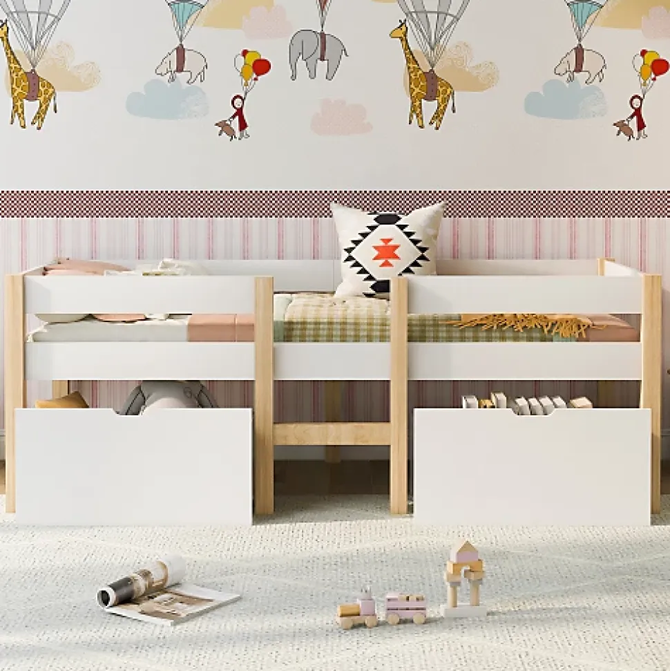 •【Apparence minimaliste】 Le lit surélevé possède une apparence minimaliste, la combinaison de couleur blanche et chêne s’intègre parfaitement dans la chambre de votre enfant et leur donne un sentiment de tranquillité.•【Espaces de rangement et roulettes des tiroirs】 Les deux tiroirs situés au bas du lit permettent de gagner de la place et peuvent être utilisés pour ranger des vêtements, des jouets ou d’autres objets d’usage quotidien. Grâce aux roulettes, les deux tiroirs en MDF pouvent être poussés et tirés facilement.•【Barrières anti-chute】 Le lit surélevé dispose des barrières anti-chute pour la sécurité de votre enfant, grâce auxquelles vous n’avez plus à vous inquiéter de la blessure de votre petit.•【Structure robuste】 Le cadre en bois de pin massif et les pieds de support au centre du lit de chaque côté confèrent au lit une structure robuste et durable.•【Facile à installer】 Le cadre de lit avec sommier à lattes est facile à monter conformément aux instructions de montage fournies.