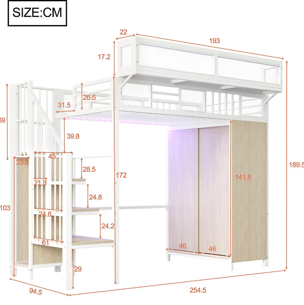 - 【Optimisation De L’Espace】 La combinaison du couchage en hauteur, de l’armoire intégrée et de l’espace libre inférieur offre une solution compacte qui libère de la place pour aménager un coin bureau ou détente.
