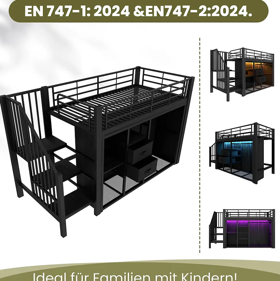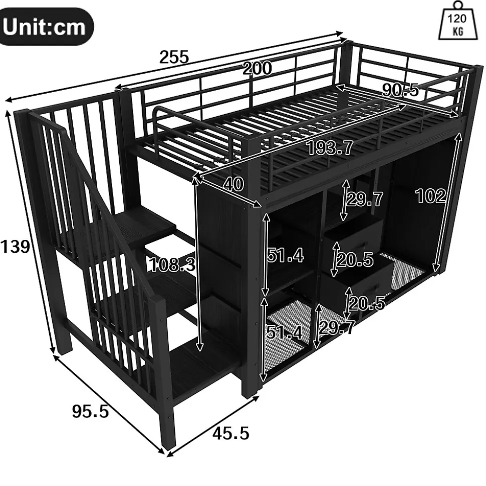 ▶ ▶ Détails ▶────────────────● Nom du produit : Lit mezzanine● Matériau : Métal + MDF● Couleur : Noir● Dimensions du produit : 255 × 95,5 × 139 cm● Dimensions du lit : 90 × 200 cm● Poids maximal supporté : 120 kg● Recommandation pour l’épaisseur du matelas : 10 cm (matelas non inclus)● Quantité de colis : 3● Montage requis : Oui● Origine : Chine► Remarques ►※ En raison de la mesure manuelle, un écart de 2-3 cm peut se produire.※ Toutes les images des produits sont prises avec des produits réels, mais des différences de couleur peuvent se produire en raison des effets de la lumière solaire et d’autres facteurs.※ Ce produit est expédié en 3 colis, qui peuvent ne pas arriver en même temps. Veuillez patienter.※ Si vous avez des questions lors de l’installation, n’hésitez pas à nous contacter.