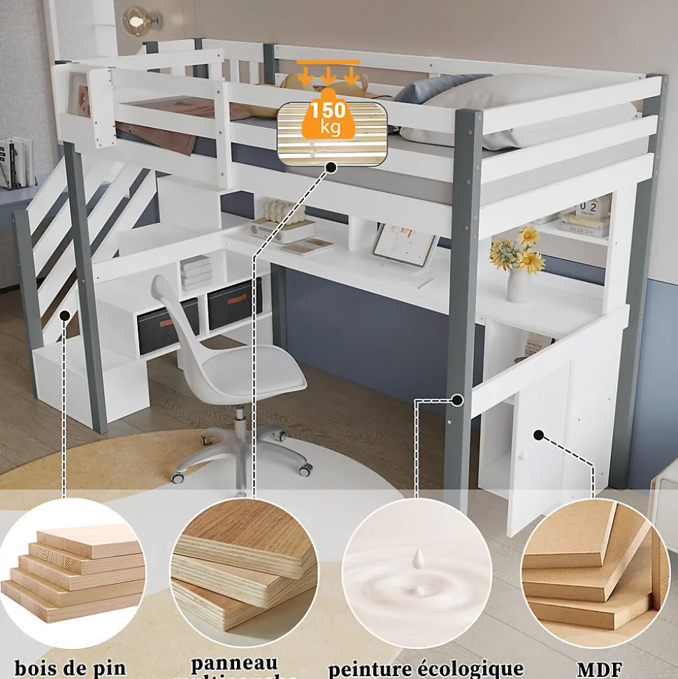 - 【Optimisation de l’espace】 Le lit mezzanine permet de libérer de l’espace au sol grâce à son étage surélevé, offrant un espace sous le lit pour un bureau, des étagères et des boîtes de rangement pour une chambre organisée et pratique.