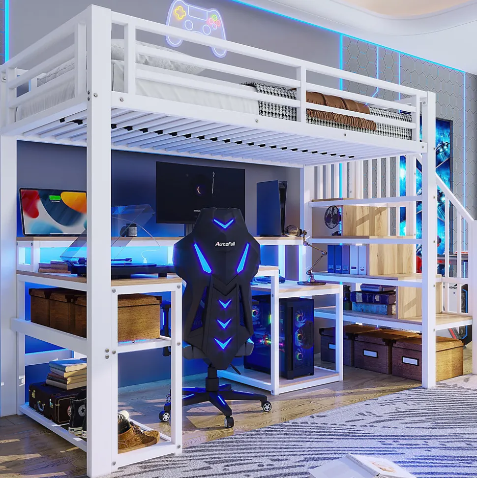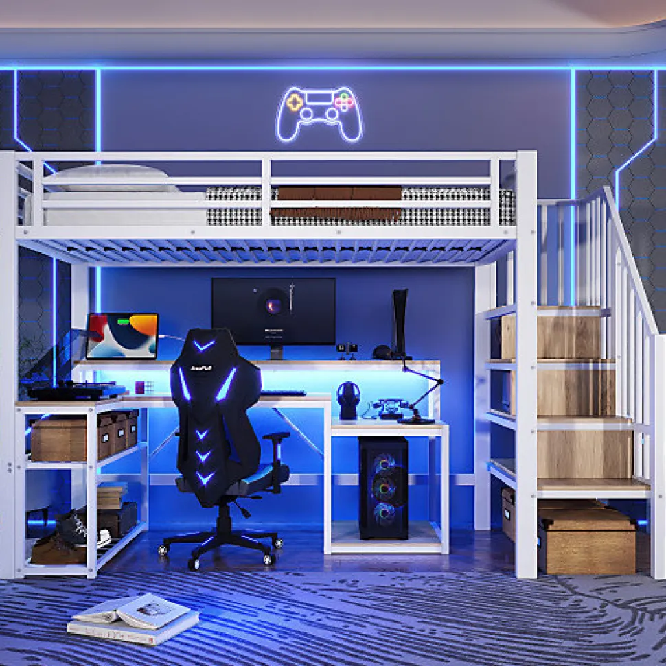 •【Structure en fer robuste + Panneaux MDF】Une structure en fer de haute qualité, associée à des panneaux MDF, garantit durabilité, sécurité et absence d’odeurs, pour un environnement de vie sain et confortable.•【Bandeau lumineux intelligent + Contrôle par application】Le bandeau lumineux flexible intégré permet de régler la luminosité et la température de couleur via une application, créant ainsi une ambiance agréable en toute circonstance.•【Port USB pratique】Un port USB intégré sur le côté du bureau permet de recharger instantanément smartphones et tablettes, vous évitant ainsi de chercher des prises et vous simplifiant la vie au quotidien.•【Rangements astucieux + Étagères】Des compartiments de rangement à plusieurs niveaux optimisent l’espace vertical, complétés par de multiples étagères, pour ranger livres et petits objets et garder votre bureau bien rangé.•【Bureau intégré pour étudier et travailler】Un plateau spacieux et ergonomique assure un confort optimal pour étudier ou travailler, tout en améliorant l’efficacité et l’organisation.•【Facile à assembler】Des instructions détaillées et des pièces complètes sont disponibles pour vous aider à réaliser l’assemblage rapidement.