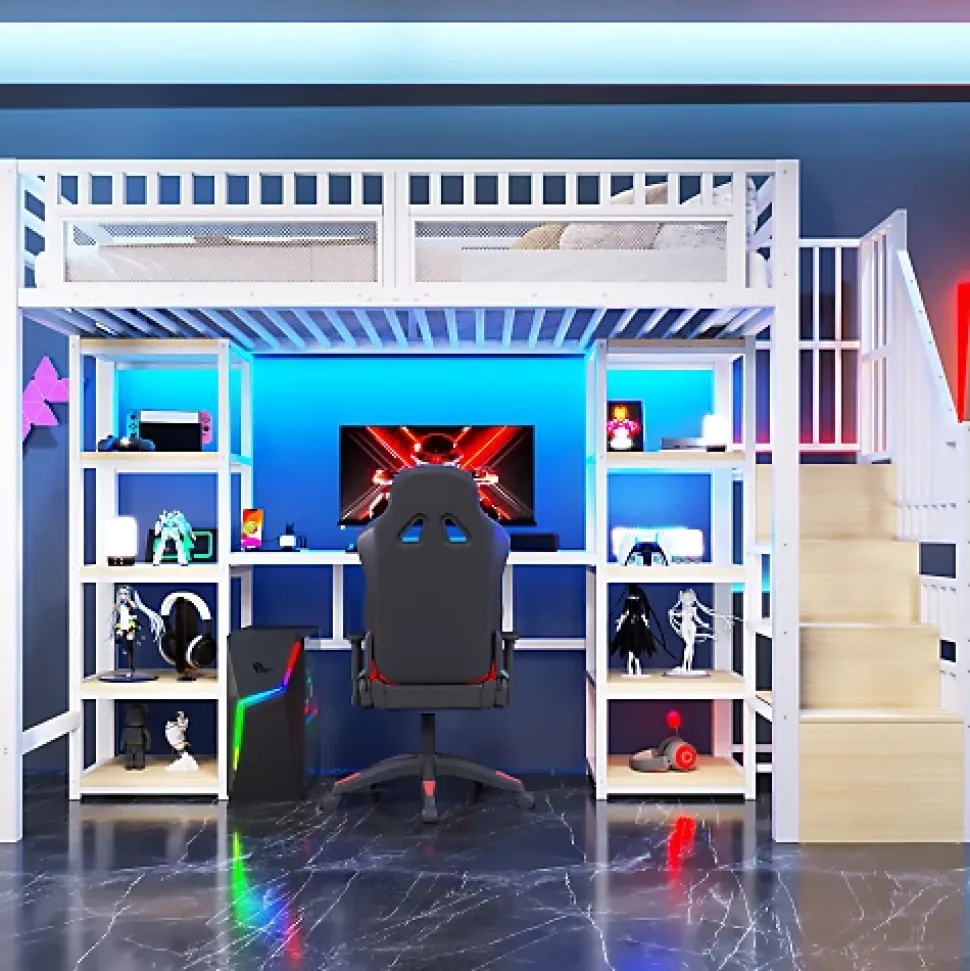 •【Un choix de qualité】Sa structure robuste en fer, associée à des panneaux MDF de haute qualité, garantit la durabilité de ce meuble. Ce choix haut de gamme vous accompagnera au quotidien en toute sérénité !•【Un éclairage féérique】Équipé de bandes LED aux couleurs vibrantes, ce bureau offre un éclairage aux teintes facilement changeables via une application. Des boutons de couleur adaptés aux enfants sont également inclus, créant ainsi un espace féérique !•【Recharge pratique】Plusieurs ports USB judicieusement placés répondent à tous vos besoins de recharge, assurant ainsi que vos appareils électroniques soient toujours chargés. Un confort inégalé !•【Un allié précieux pour vos études】Plus qu’un simple bureau, il intègre des fonctions dédiées aux études, facilitant ainsi vos tâches scolaires et professionnelles. Ce meuble multifonctionnel offre un excellent rapport qualité-prix !•【Une solution de rangement optimale】Ses étagères et rangements intégrés uniques créent instantanément un espace net et organisé. Optimisant l’espace, même les petits appartements restent impeccables !•【Facile à assembler】Des instructions détaillées et des pièces complètes sont disponibles pour vous aider à réaliser l’assemblage rapidement.