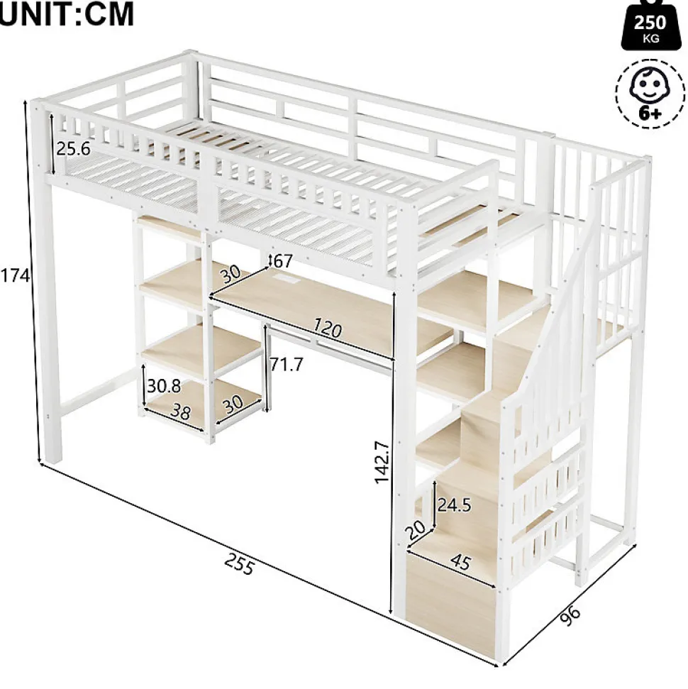 Spécifications● Couleurs du produit : Blanc● Dimension du produit : 255x96x174cm● Matériau du produit : Métal + MDF● Poids du produit : 80kg● Capacité de charge : 250kg● Épaisseur recommandée du matelas : 10cm(Matelas non inclus)● Montage requis : Oui● Nombre de colis : 3Attentions● Ce produit est divisé en 3 colis pour la livraison. Il se peut qu’ils n’arrivent pas en même temps. Merci d’attendre patiemment.● La livraison comprend un cadre de lit, un sommier à lattes. Le matelas n’est pas compris dans la livraison.● Si vous avez des questions pendant l’installation, veuillez nous contacter dès que possible.
