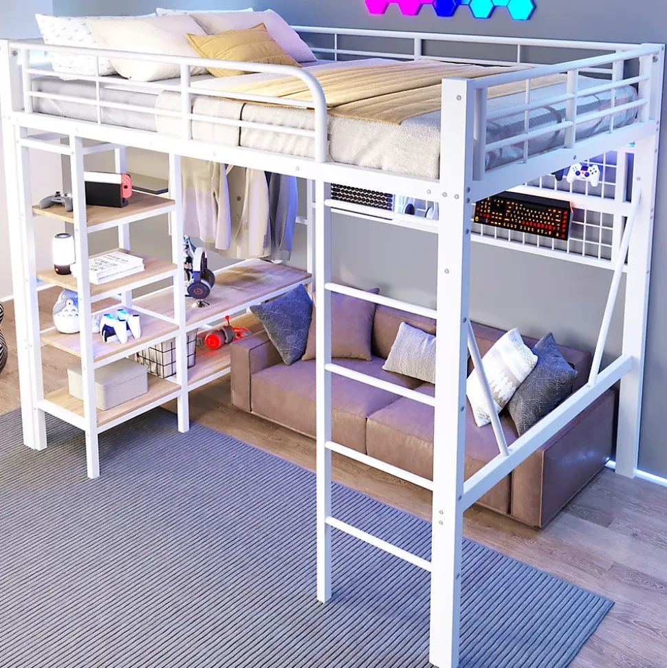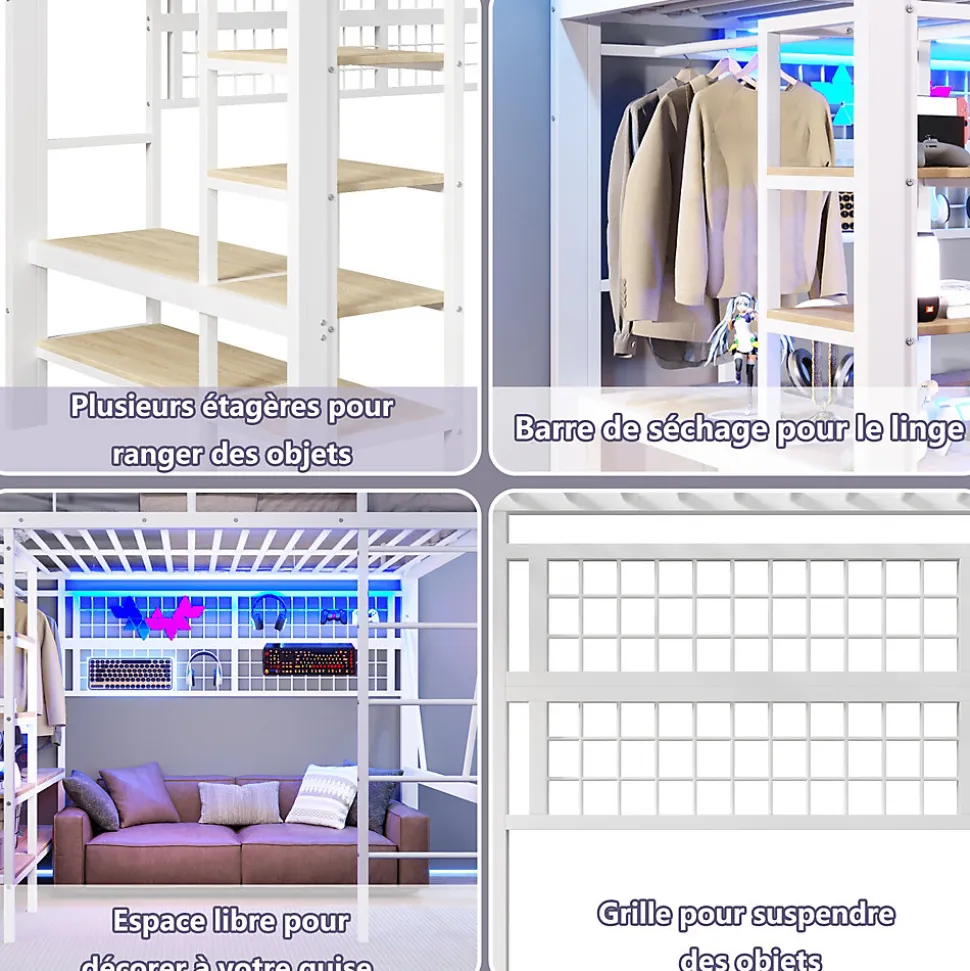 Lit mezzanine en fer 140 x 200 cm avec bande lumineuse LED, compartiment de rangement, tringle à vêtements, sans matelas, blanc