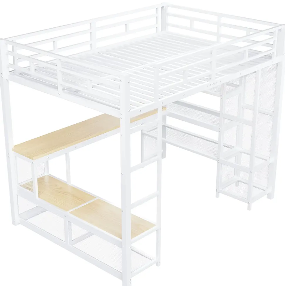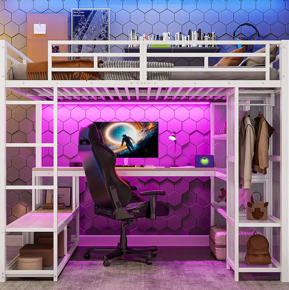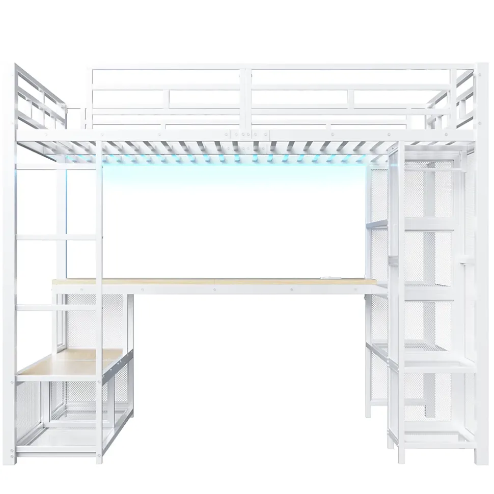 •【Gain de place】Ce lit mezzanine en métal offre un espace de couchage généreux et des rangements pratiques, avec un lit superposé de 140 x 200 cm, un bureau intégré et des compartiments de rangement. Il optimise l’espace en alliant fonctionnalité et style.•【Avec bureau et étagères】En plus d’un espace de couchage confortable, ce lit offre un espace fonctionnel et pratique pour travailler, étudier ou jouer. Un bureau intégré se trouve sous le lit, et des étagères latérales permettent de ranger vos objets du quotidien.•【Éclairage LED intégré】Des bandes lumineuses LED peuvent être placées sous le bureau ou sous le lit pour créer une ambiance agréable le soir. Vous pouvez choisir parmi 16 couleurs grâce à une télécommande.•【Armoire avec rangements】Ce lit est également équipé d’une armoire en filet avec crochets intégrés pour ranger vos vêtements.•【Sécurité garantie】Le lit superposé est équipé de barrières de sécurité continues, qui stabilisent la structure et assurent votre sécurité.•【Facile à assembler】Des instructions détaillées et des pièces complètes sont disponibles pour vous aider à réaliser l’assemblage rapidement.
