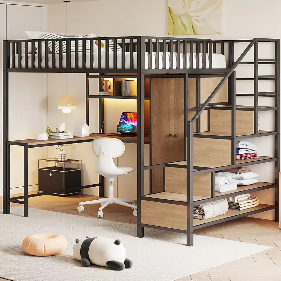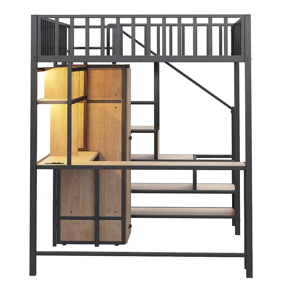 •【Lit mezzanine multifonctionnel avec barrières de sécurité】Ce lit mezzanine en métal dispose d’un espace de couchage à l’étage, entouré de barrières de sécurité verticales en métal pour une sécurité optimale. L’espace en dessous intègre astucieusement un bureau, une armoire et des rangements, optimisant ainsi l’espace de la chambre et améliorant sa fonctionnalité.•【Rangement intégré sous le lit】Ce lit mezzanine est équipé d’un bureau et d’étagères à plusieurs niveaux en dessous, créant un espace de travail ou d’étude idéal. De plus, l’armoire en dessous offre un grand espace de rangement grâce à ses tiroirs. L’armoire comprend également une tringle pour suspendre soigneusement les vêtements et autres objets.•【Éclairage d’ambiance LED et prises de recharge】Le rangement sous le lit de ce lit mezzanine en métal est doté d’un éclairage LED à couleurs changeantes pour créer une ambiance personnalisée. Le bureau sous le lit est équipé de prises électriques aux normes européennes, incluant des prises secteur, des ports USB et des ports USB-C pour recharger facilement vos appareils.•【Échelle de rangement sécurisée】Ce lit en métal est équipé d’une échelle de rangement sécurisée sur un côté pour un accès facile. L’espace de rangement supplémentaire sous l’échelle peut accueillir des livres, des jouets et autres objets.•【Structure métallique robuste】Ce lit mezzanine en fer forgé est doté d’une structure métallique haut de gamme, lui conférant une stabilité et une durabilité exceptionnelles. Alliant avec élégance le métal et les panneaux de bois, il est disponible en blanc ou en noir pour s’harmoniser avec tous les styles de décoration intérieure.•【Facile à assembler】Des instructions détaillées et des pièces complètes sont disponibles pour vous aider à réaliser l’assemblage rapidement.