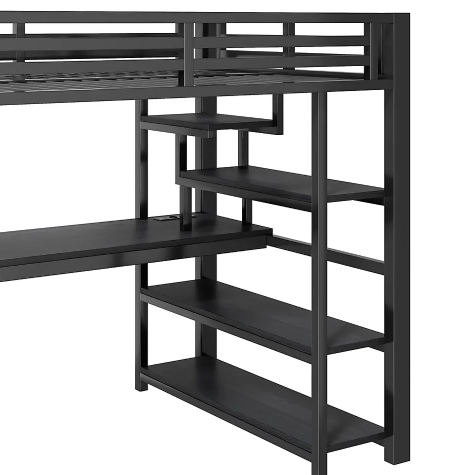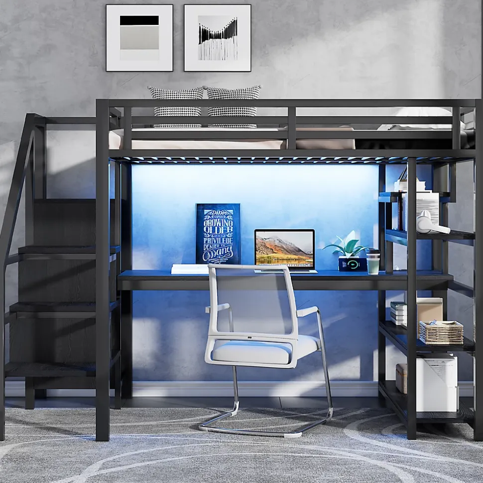 •【Armoire et escalier】L’armoire est équipée de penderies intégrées, et l’escalier intégré sert à la fois d’escalier et d’espace de rangement pour les objets du quotidien.•【Éclairage LED et station de recharge】L’étagère au-dessus du bureau est dotée de lumières LED contrôlables via une application Bluetooth. Associée à la station de recharge sur le bureau, cette mezzanine offre un espace de travail ou de loisirs confortable.•【Étagère à quatre niveaux】Cette étagère à quatre niveaux sert à la fois de bibliothèque et de rangement pour les livres et autres objets du quotidien, optimisant ainsi l’espace.•【Structure métallique robuste】Ce lit mezzanine est doté d’une structure métallique robuste avec une échelle intégrée, des garde-corps continus et des barres métalliques solides pour une sécurité et une stabilité maximales.•【Facile à assembler】Des instructions détaillées et des pièces complètes sont disponibles pour vous aider à réaliser l’assemblage rapidement.
