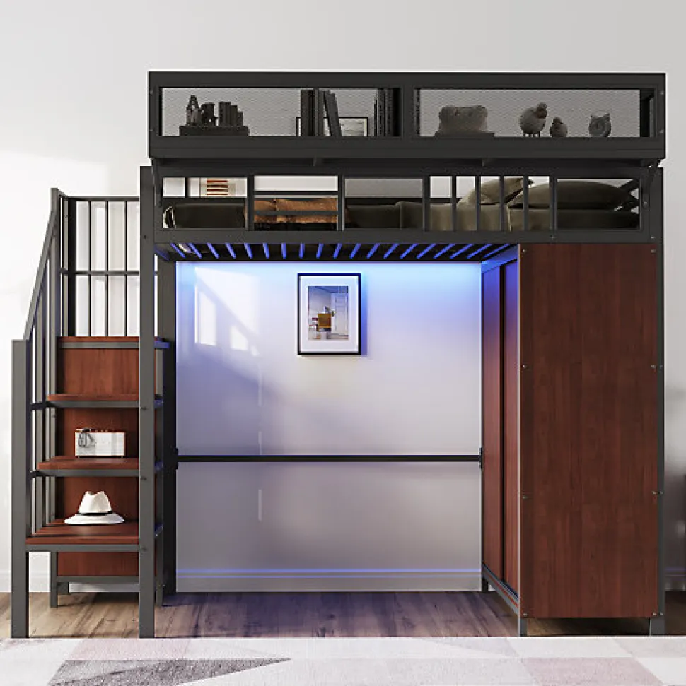 •【Design de rambarde remarquable】Ce lit mezzanine est doté d’une rambarde avant au design unique, combinant des panneaux en maille métallique et des barres horizontales et verticales, pour un style à la fois simple et original. Une étagère supplémentaire en maille métallique est intégrée à la rambarde, offrant un espace de rangement additionnel. Cette étagère est facilement amovible et installable selon vos besoins.•【Armoire intégrée】Ce lit mezzanine en métal est équipé d’une spacieuse armoire à portes coulissantes sur un côté, avec une tringle pour un rangement soigné et organisé de vos vêtements.•【Éclairage LED intelligent】Ce lit mezzanine en métal intègre une bande LED à couleurs changeantes sous le cadre de lit, vous permettant de personnaliser votre ambiance en changeant les couleurs selon vos envies.•【Échelle de rangement sécurisée】Ce lit en métal est équipé d’une échelle de sécurité sur un côté pour un accès facile au lit. L’espace de rangement supplémentaire sous l’échelle peut accueillir livres, jouets et autres objets. L’échelle comprend également une petite armoire, offrant un espace de rangement supplémentaire pour les vêtements ou les objets du quotidien.•【Conception gain de place】Ce lit mezzanine en métal intègre astucieusement l’espace de couchage et le rangement, tout en créant un espace ouvert spacieux en dessous. Cet espace multifonctionnel peut servir de bureau, de coin lecture ou de solution de rangement personnalisable.•【Structure métallique robuste】Ce lit en fer forgé possède une structure métallique de haute qualité, lui conférant une stabilité et une durabilité exceptionnelles. Le lit mezzanine allie avec élégance le métal et les panneaux de bois et est disponible en blanc ou en noir pour s’harmoniser parfaitement avec tous les styles de décoration intérieure.•【Facile à assembler】Des instructions détaillées et des pièces complètes sont disponibles pour vous aider à réaliser l’assemblage rapidement.