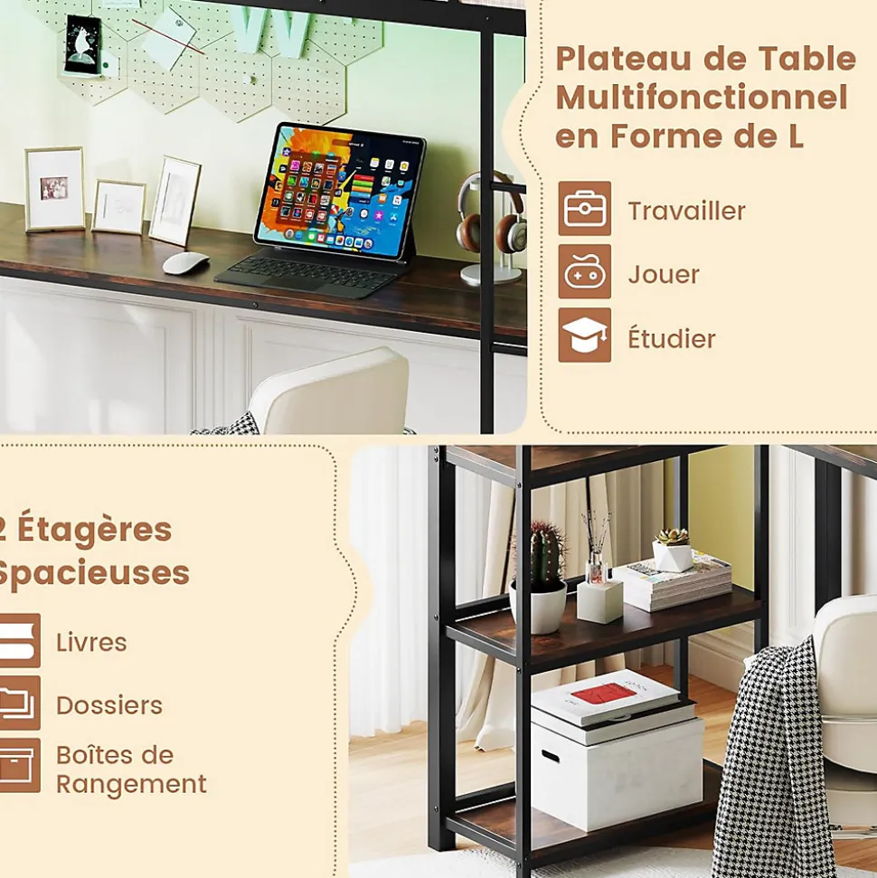 - Lit Efficace et Confortable : Ce lit mezzanine allie efficacité et confort, offrant un bureau d’étude en L ingénieusement conçu et une station de charge (2 prises AC et 2 ports USB) sous le lit. Cette configuration offre une commodité ultime pour étudier et travailler, garantissant que tous vos appareils soient toujours chargés.