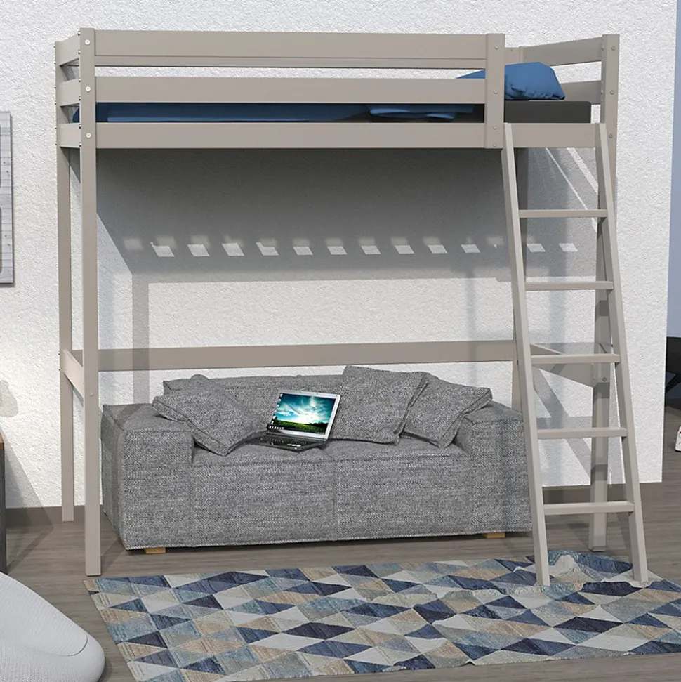 Lit mezzanine STUDIO 90 x 190 cmÉpicéa massif.Finition : laqué gris taupeSection des pieds : 50x50mm.Hauteur de passage (sous pan) : 152,8 cm.Échelle réversible.* Hauteur maximale de matelas conseillée : 14 cm* Charge maximale d’utilisation : 80 kg* Age minimal d’utilisation : 6 ansLivré démonté avec 1 sommier à lattes, sans matelas ni accessoires de décoration, A monter soi-mêmeDimensions:L199xP151xH195 cm