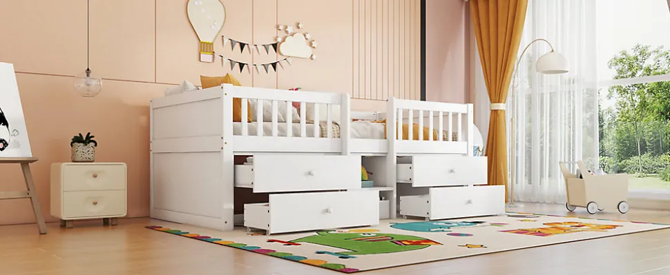 Description :Ce lit pratique est idéal pour les enfants, avec ses quatre tiroirs de rangement qui optimisent l’espace. Conçu en bois de pin et MDF, il est robuste et durable. La barre de sécurité et l’échelle garantissent un environnement sécurisé pour les enfants, tout en offrant une belle solution de rangement.Caractéristiques :Matériaux : Pin + MDFDimensions : 90 x 200 cmHauteur totale : 80.5 cmPoids maximal supporté : 120 kgNombre de colis : 2Montage nécessaire : OuiDimensions recommandées pour le matelas : 10 cm (non inclus)Détails supplémentaires :Grande capacité de rangement : Quatre tiroirs pratiques sous le lit pour une organisation facile.Sécurité accrue : Grilles autour du lit pour éviter les chutes accidentelles.Pratique et élégant : Un design simple et moderne qui s’intègre dans divers décors.Livraison : Expédié en 2 colis depuis l’Allemagne, avec des délais de livraison potentiellement différents.