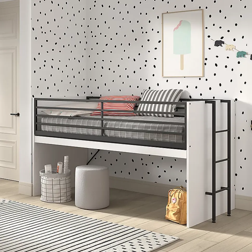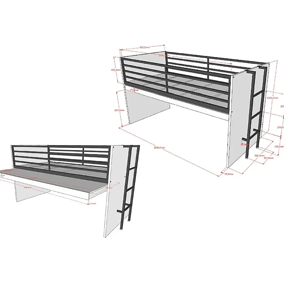 - Caractéristiques : A partir de 6 ans – Bureau coulissant – Echelle pouvant être fixée à droite ou à gauche incluse – Sommier inclus – Charge maximale conseillée : 110 kg – Epaisseur maximale recommandée pour le matelas : 20 cm vendu séparément