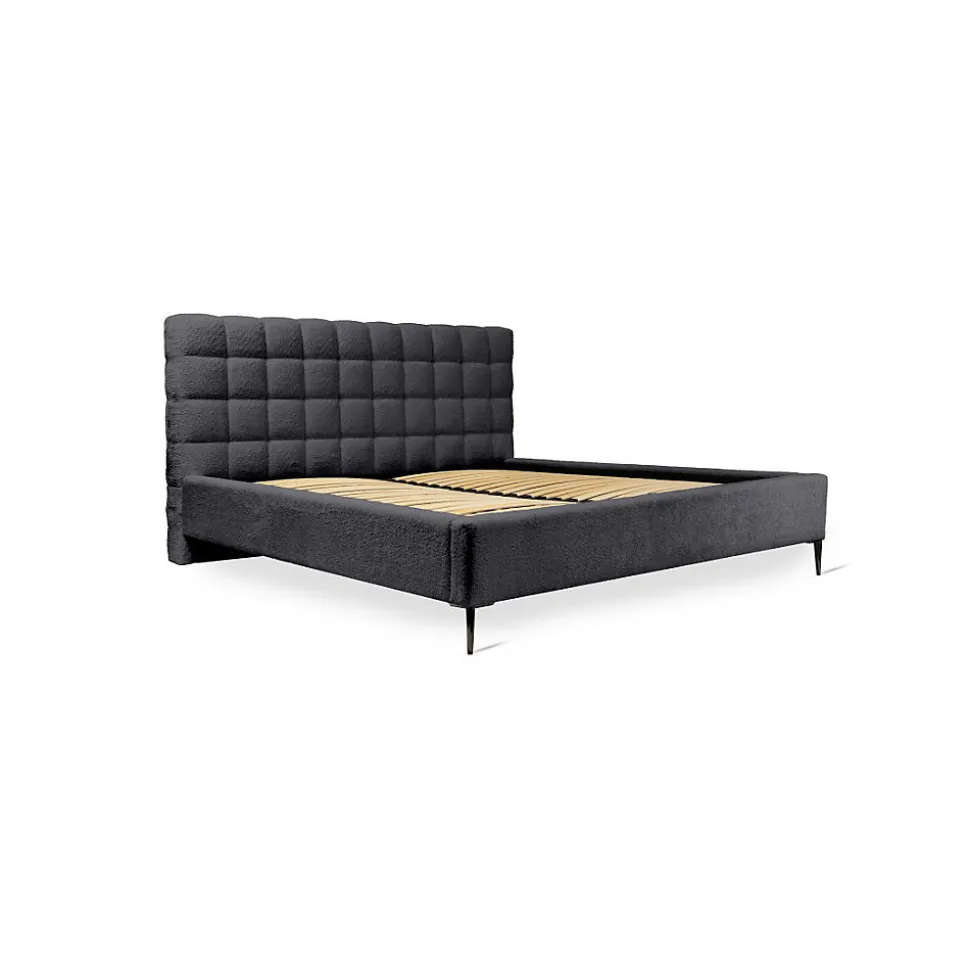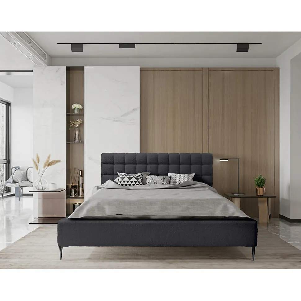Lit haut de gamme 180×200 en tissu chenille bouclé noir – Tête de lit capitonnée style hôtelLe lit MILLIO 180×200 cm en tissu chenille bouclé noir combine confort exceptionnel et esthétisme affirmé. Avec ses lignes contemporaines et sa teinte profonde, il s’impose comme un véritable élément de caractère pour une chambre adulte moderne, élégante et raffinée.Sa tête de lit capitonnée de 112 cm en carrés géométriques donne du relief à l’espace nuit, tandis que le sommier à lattes inclus assure une excellente ventilation du matelas et un confort de couchage optimal. Sa structure en bois massif et panneaux de particules haute densité garantit une solidité durable. Enfin, les pieds en métal noir de 15 cm ajoutent une touche légère et design.Pourquoi choisir notre lit MILLIO 180×200 – Lit noir capitonné en tissu bouclé haut de gammeLe lit MILLIO noir séduit par son allure intemporelle et sa qualité hôtelière premium. Son tissu chenille bouclé est aussi doux qu’élégant, et sa couleur noire en fait une pièce maîtresse facile à intégrer dans une décoration sobre ou contemporaine. C’est le choix idéal pour un espace nuit à la fois confortable et prestigieux.Caractéristiques techniques du lit MILLIO – Lit adulte 2 places 180×200 noir avec sommier Type de produit : Lit tapissé haut de gamme avec sommier Collection : MILLIO Dimensions couchage : 180×200 cm Structure : Bois massif, panneaux de particules haute densité, mousse polyuréthane Revêtement : Tissu chenille bouclé – Coloris noir Tête de lit : Haute (112 cm), capitonnée en carrés géométriques Sommier : Inclus – Lattes en bois sur cadre rigide Hauteur du cadre : 24 cm Pieds : Métalliques noirs – Hauteur 15 cm Dimensions hors-tout : L225 x l198 x H112 cm Nombre de colis : 3 (Poids 128 kg)Les avantages du lit MILLIO – Grand lit noir capitonné avec tissu bouclé Tissu chenille bouclé noir : Élégance contemporaine et confort enveloppant Design capitonné inspiré de l’hôtellerie : Finitions soignées et style affirmé