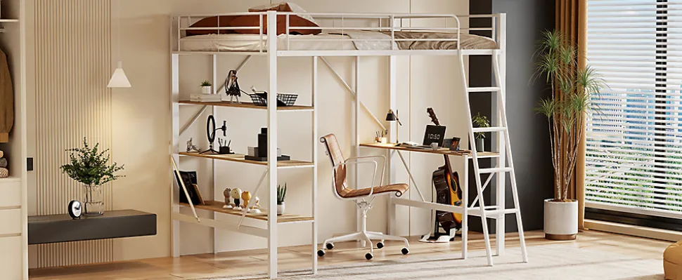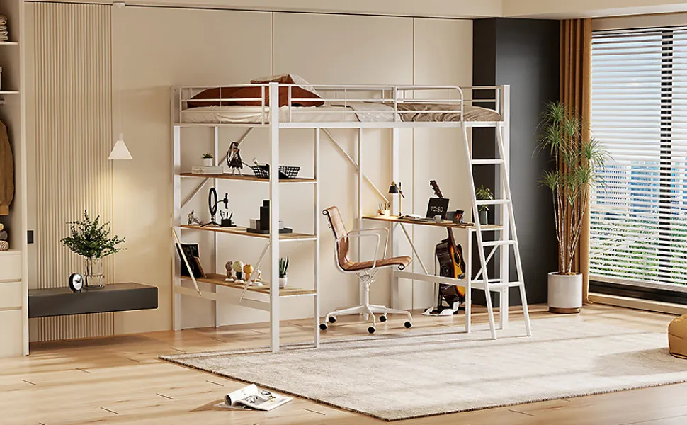 This loft bed provides a stylish and comfortable space for sleeping, studying, and working. With a spacious desk and three large shelves, it is perfect for homework, reading, writing, and more. The sturdy iron frame ensures strength, stability, and durability. The built-in ladder provides safe and easy access to the upper bed. Its minimalist, neutral design makes it suitable for all ages, and it’s perfect for maximizing space in smaller rooms.Features:Materials: Metal + MDFDimensions: 204.5 x 149 x 180.5 cmWeight Capacity: 120 kgRecommended Mattress Thickness: 10-15 cmNumber of Slats: 24Assembly Required: YesOrigin: ChinaBenefits:Durable Construction: Sturdy steel frame and robust MDF ensure long-lasting use.Functional Design: Includes a desk and three large shelves for work and storage.Space-Saving: Ideal for small spaces, providing sleeping and working areas in one.Safety: The upper bed is surrounded by strong guardrails for added security.Delivery: Ships in two packages from Germany. Delivery may vary.