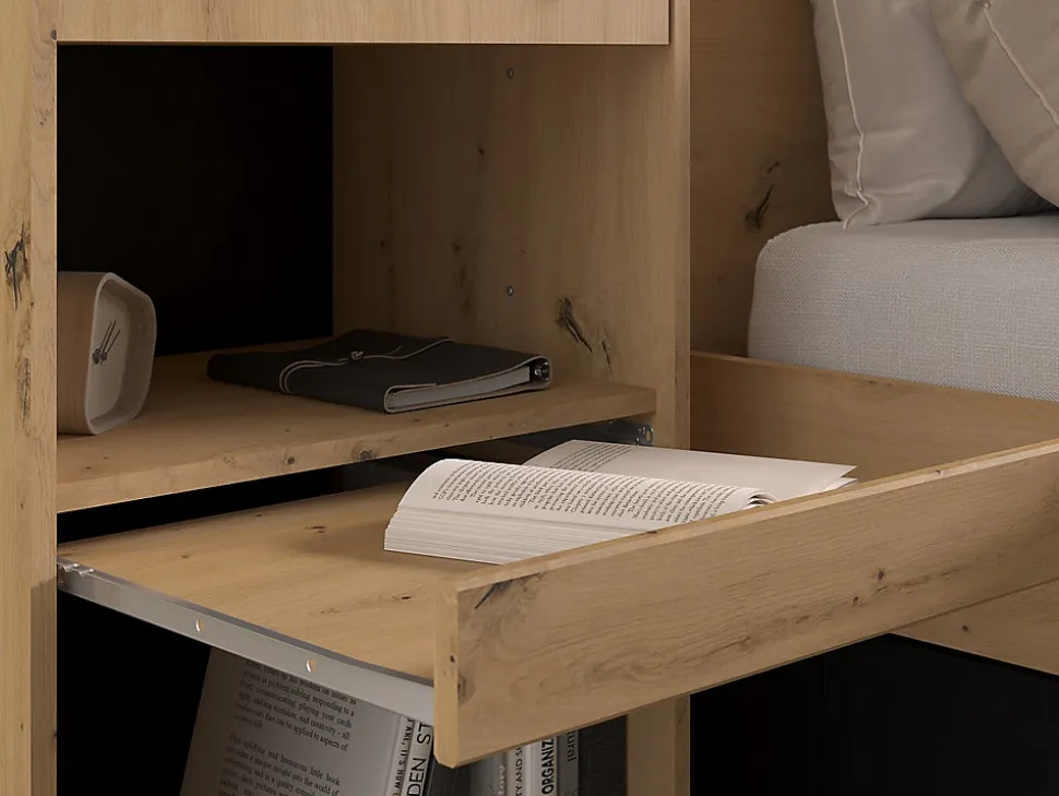 - Lit pont 140 x 190/200 cm avec rangements – Avec LEDs – Structure : Panneaux de particules – Coloris : Naturel et noir – Dim : L164,5 x P204 x H83 cm – Style : Contemporain + Sommier – Tout à portée de lit avec VARLY !
