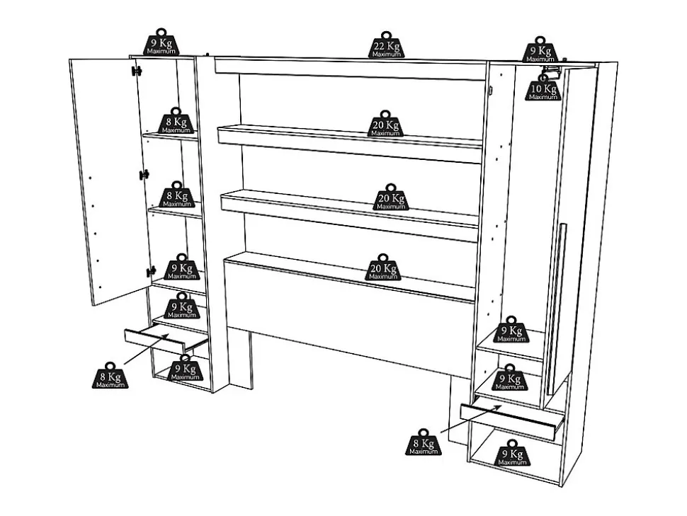 Livres, réveil, lunettes, pyjama … Tout ce dont vous pouvez avoir besoin peut être au plus proche de vous et de votre espace de couchage grâce aux meubles VARLY. Avec eux, vous optimisez votre espace tout en conservant un maximum de rangements, le tout avec un design moderne et épuré ! A savoir : ce lit est compatible avec tous les sommiers et matelas 140 x 190 cm et 140 x 200 cm mais nous vous proposons ici un sommier de la taille la plus grande et non modulable, c’est-à-dire 140 x 200 cm.Caractéristiques Couleur (nuance) : Naturel clair, Noir Matière (précision) : Panneau de particule Structure : Panneau de particules Finition : Mélaminé Taille (couchage) : 140 x 190 cm, 140 x 200 cm Nombre de places : 2 places Avec leds Couleur des LEDs : Multicolore Type de commande : Télécommande Type de branchement : Prise secteur Sans matelas Avec sommier Avec chevet 2 portes Porte battante Mécanisme ouverture (porte) : Prise de main Type de rangement : 2 tiroirs, 4 niches, Tablette, Etagère, 1 penderie Nombre d’étagères : 6 2 tablettes Produit exclusif À monter soi-mêmeDimensions Longueur : 269.7 cm Hauteur : 202.8 cm Profondeur : 204 cm Hauteur de couchage : 39.7 cmLivraisonLors de la livraison, il est conseillé de vérifier que le bon nombre de colis a été livré.ColisColis n°1 : Longueur 212 cm, Largeur 90 cm, Hauteur 6 cm, Poids 36 kg. Colis n°2 : Longueur 197 cm, Largeur 32 cm, Hauteur 6 cm, Poids 12 kg. Colis n°3 : Longueur 203 cm, Largeur 33 cm, Hauteur 7 cm, Poids 19 kg. Colis n°4 : Longueur 182 cm, Largeur 50 cm, Hauteur 10 cm, Poids 34 kg. Colis n°5 : Longueur 150 cm, Largeur 54 cm, Hauteur 10 cm, Poids 34 kg. Colis n°6 : Longueur 215 cm, Largeur 56 cm, Hauteur 8 cm, Poids 41 kg.